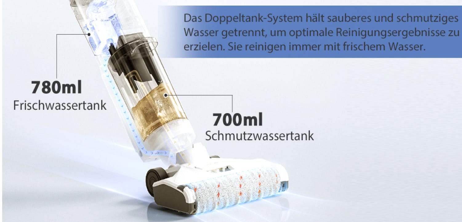 Umso interessanter ist es, dass das Unternehmen auch Wischsauger im Portfolio hat. Der Neakasa PowerScrub II ist einer davon. Er besitzt einen 3000 mAh starken Akku, der 30 Minuten durchhalten soll. Ein 780 ml großer Frischwassertank im Gerät, versorgt stetig die rotierende Bodenwalze mit Wasser. Das Schmutzwasser wird zudem in einen 700 ml großen Abwassertank befördert.