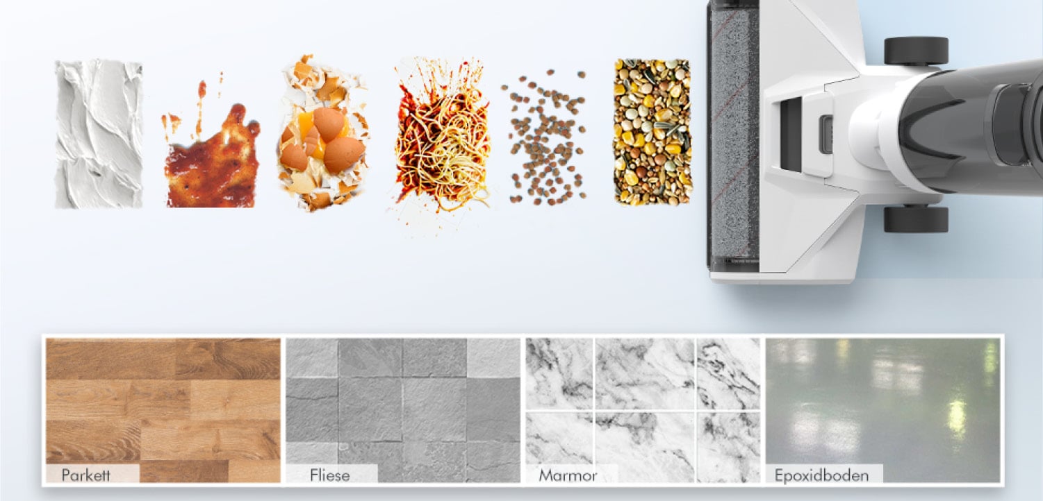 Der Wischsauger eignet sich hervorragend für das Aufsaugen und Aufwischen von gröberen Missgeschicken, wie beispielsweise eine heruntergefallene Müslischüssel oder fest getrocknetem Kaffee bzw. Schmutz. Es benötigt kaum Arbeit, um solche Verschmutzungen restlos mit dem Neakasa PowerScrub II zu beseitigen.