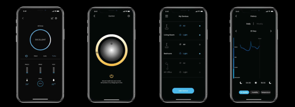Die Airluna App dient gleichzeitig zur Steuerung der Beleuchtung und der Luftreinigungs-Funktion. In der App werden zudem auch Informationen über die Luftqualität angezeigt.
