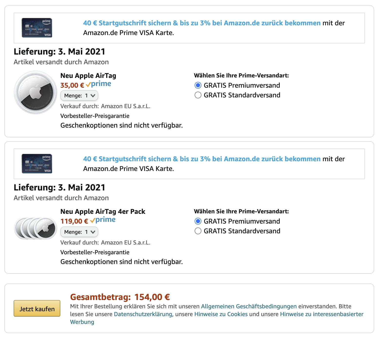 - Amazon – AirTags 4er Pack ohne Gravur: 03.05.2021