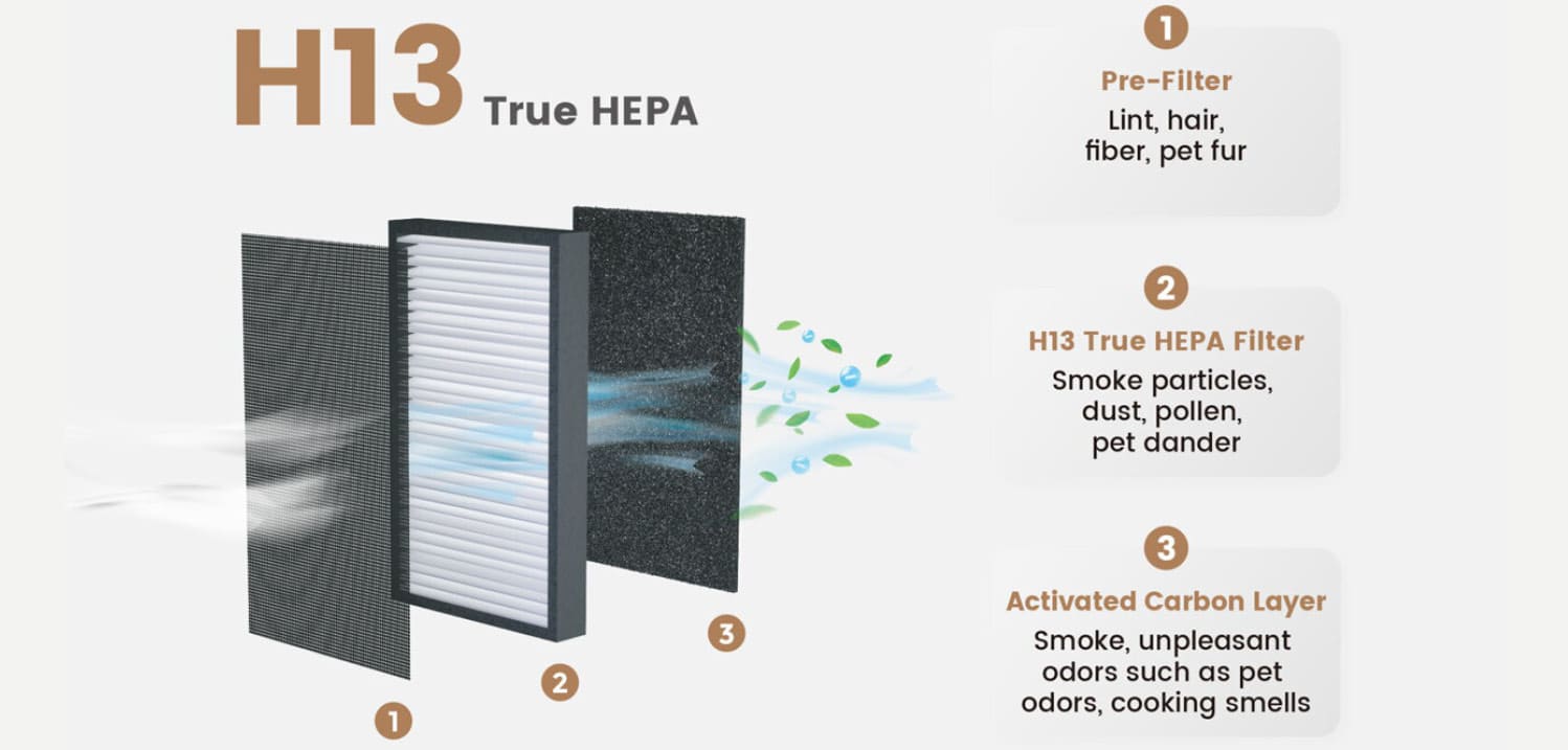 Eingesetzt ist ein robustes 3-stufiges Filtersystem, das aus Vorfilter, H13-HEPA-Filter und Aktivkohlefilter besteht. Dieser ist in der Lage, 99,97 Prozent aller schädlichen Partikel aus der Luft zu filtern. Optimiert ist er für mittlere bis große Räume von ca. 28 Quadratmeter und schafft eine Luftreinigungsleistung von 221 Kubikmeter die Stunde. Der Filter hält dabei ganze 3000 Stunden durch, bevor er gewechselt werden muss.