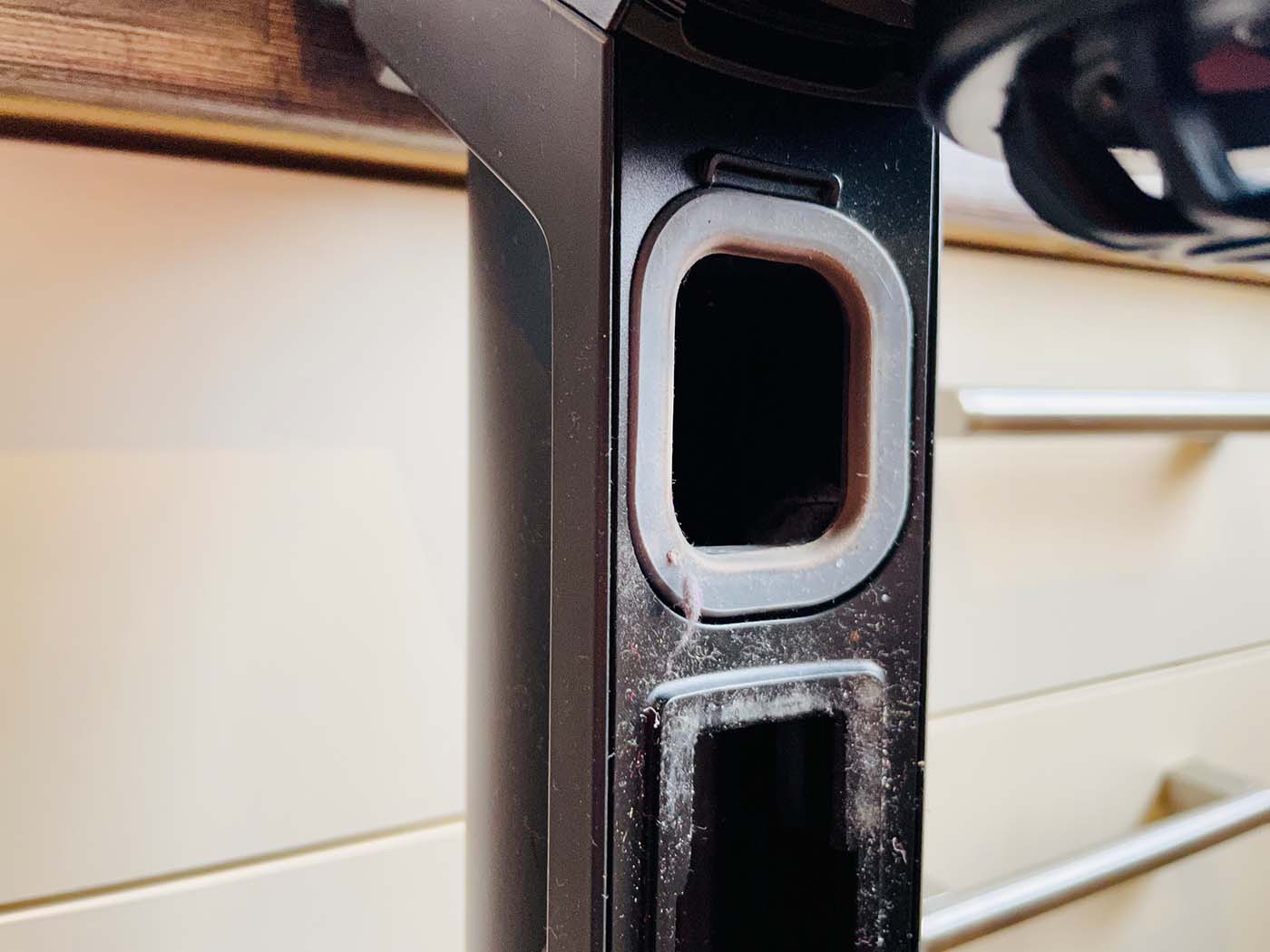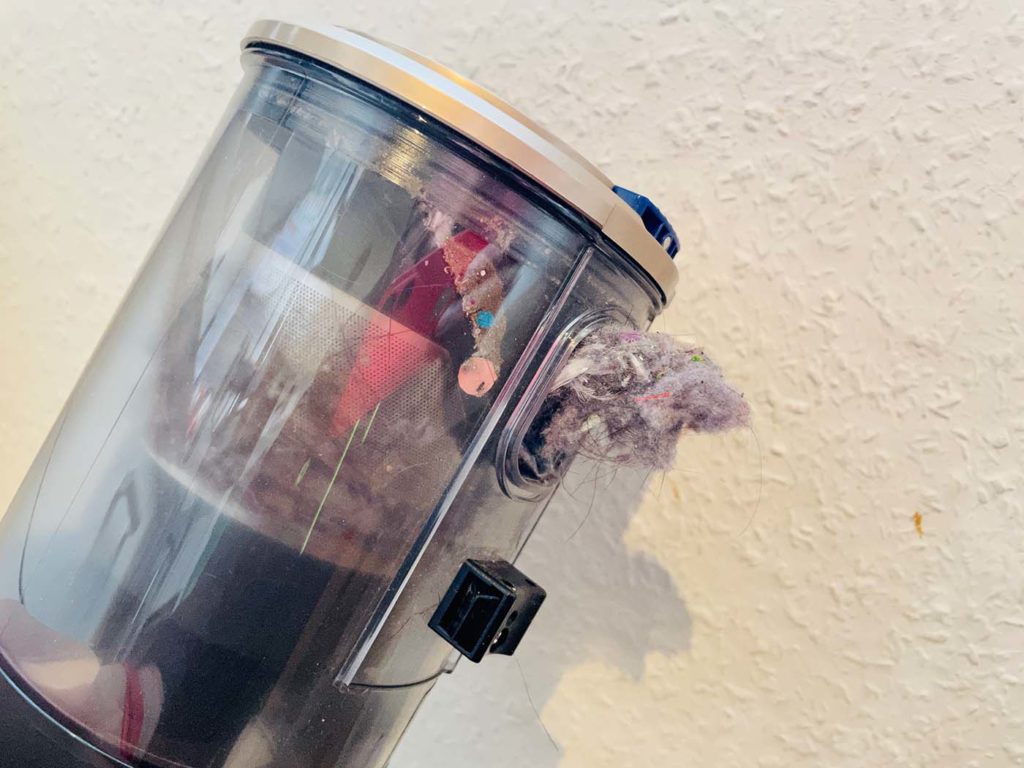 Hier kommen wir schon zu einer Fehlerquelle, welche viele Nutzer häufig nicht entdecken. Vom Saugrohr gelangt der aufgesaugte Schmutz über einen Einlass in den Staubbehälter. Saugt man viele, gröber Verschmutzungen gleichzeitig auf, kann es hier zu Verstopfungen kommen. Leider haben, besonders günstige Akkusauger, hier eine sehr schmale Öffnung, die recht schnell verstopfen kann. Meist ist der Verlust der Saugleistung hier mit einer höheren Frequenz des Sauggeräusches gepaart. Achtet also auch darauf, wenn sich euer Akkusauger beim Saugen anders anhört als gewöhnlich.