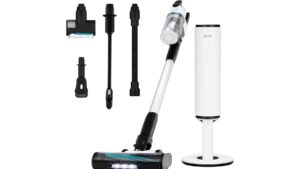Eine herausstechende Besonderheit macht den Miele Triflex HX2 Pro zu einem der besten Akku Staubsauger des Jahres 2025 – sein modularer Aufbau. Möchte man das Gewicht lieber weiter am Boden haben und ihn so für längere Zeit komfortabel nutzen, wird das Saugmodul einfach am unteren Ende angebracht. Möchte man lieber die Saugeinheit oben angebracht haben, um dann mit dem Rohr etwa die Decke von Spinnweben zu befreien, wird er einfach umgebaut. Außerdem kann er durch seinen modularen Aufbau auch frei stehen. Dazu muss die Saugeinheit aber unten sein. LEDs um dunkle Bereiche auszuleuchten sind ebenfalls vorhanden.