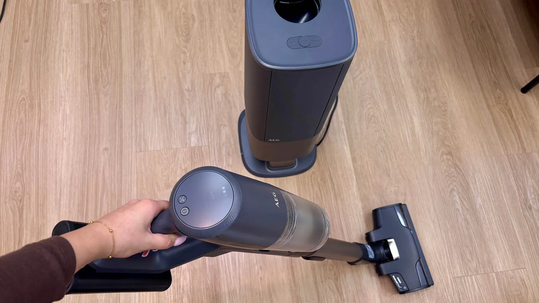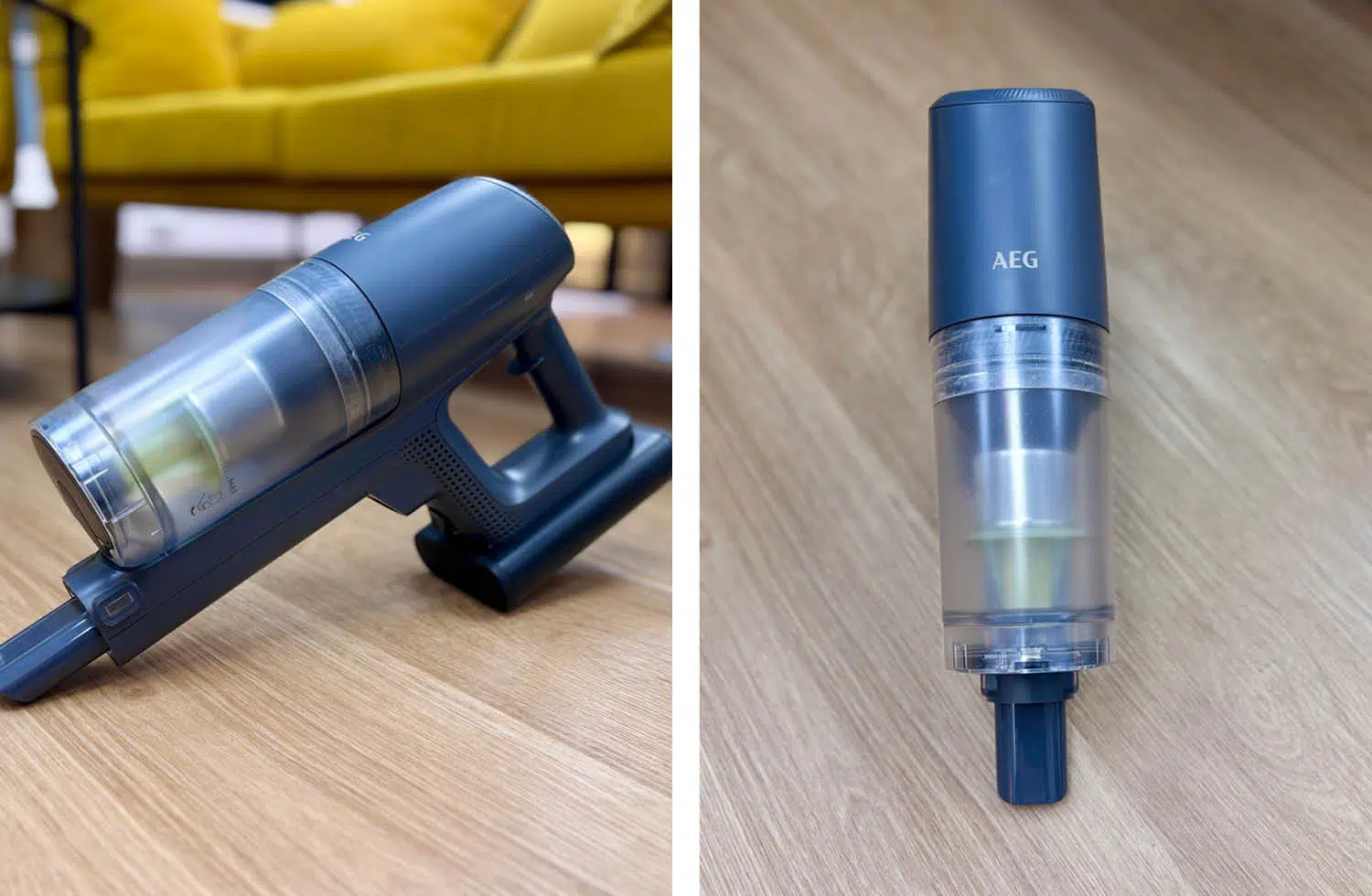 Der AEG 8000 Ultimate ist leicht genug, um längere Reinigungseinsätze ohne Ermüdung zu bewältigen. Dank der ausgewogenen Gewichtsverteilung liegt er gut in der Hand und lässt sich präzise führen, auch bei Arbeiten über Kopf oder an schwer erreichbaren Stellen. Praktisch ist hier auch die Funktion, den Aufsatz nur mit den Füßen zu entfernen. Die Handhabung wirkt insgesamt sehr komfortabel und durchdacht.