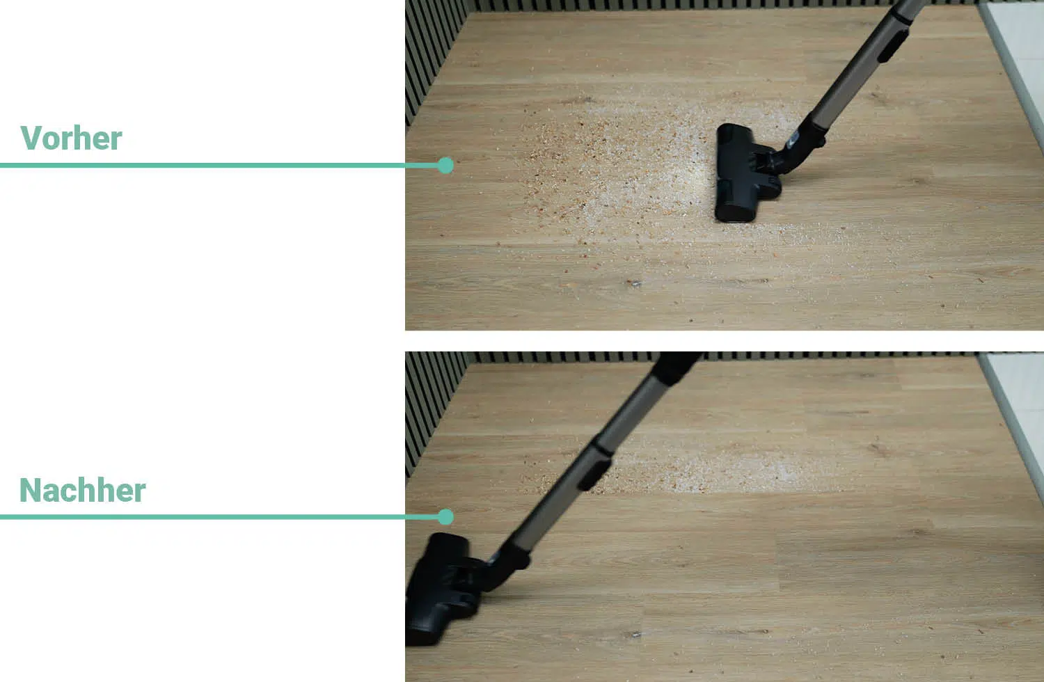 In unseren Saugtests müssen unsere Akkusauger innerhalb von einer Minute 100 Gramm verteilten Schmutz sowohl auf Hart- als auch auf Teppichböden entfernen. Hierbei werden die Akkusauger gleichmäßig fortbewegt. Ausschlaggebend ist hier, wie viel Schmutz der Sauger innerhalb dieser Minute aufgesaugt hat.