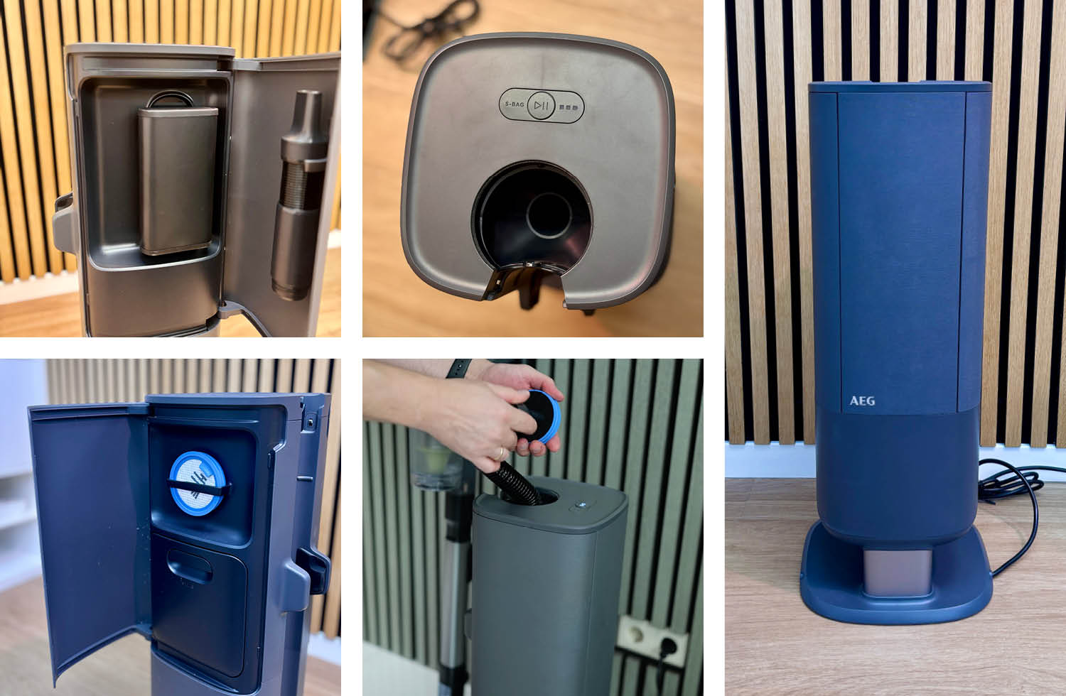 Highlight des AEG 8000 Ultimate ist natürlich die Absaugstation. Diese nimmt einem viel Arbeit im Alltag ab, da man den Akkusauger nach Benutzung einfach in die Station stellen kann. Dort wird dieser automatisch entleert und geladen. Die Station ist sehr hochwertig und die Seitentüren sind sogar in Stoffoptik.