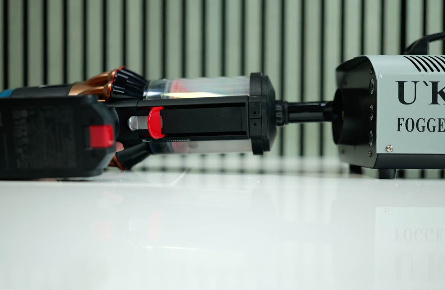 Der Staubbehälter der Einheit fasst rund 1,3 Liter hat durch einen roten Hebel die Möglichkeit, den Staub nach unten zu drücken und somit zu komprimieren, wodurch das Entleeren seltener nötig wird. Zudem lässt sich der Behälter dank intelligenter Konstruktion einfach und hygienisch mit einem Knopfdruck entleeren. Der Akku ist wechselbar und kann ganz einfaach durch einen Knopfdruck entnommen werden.