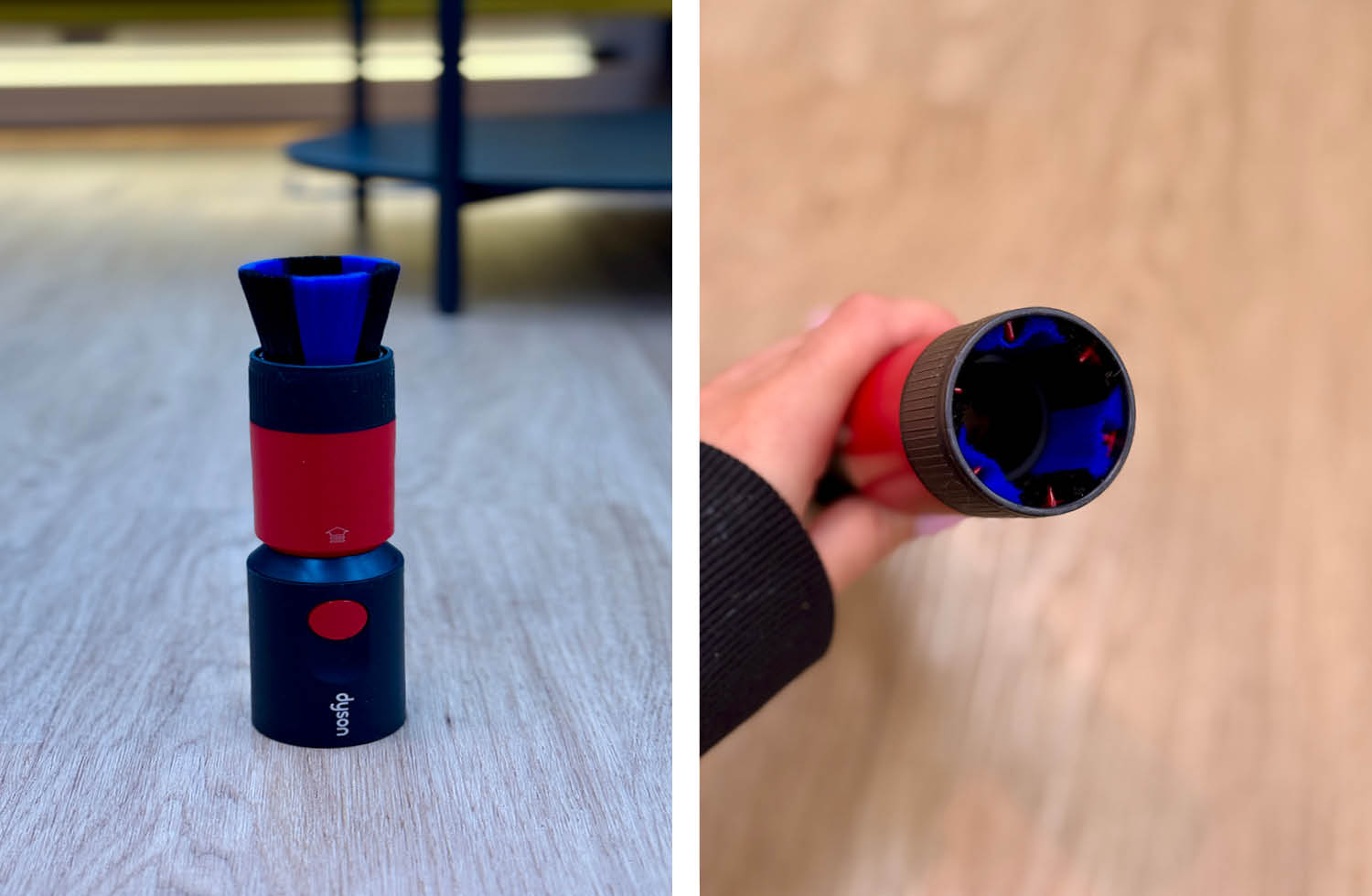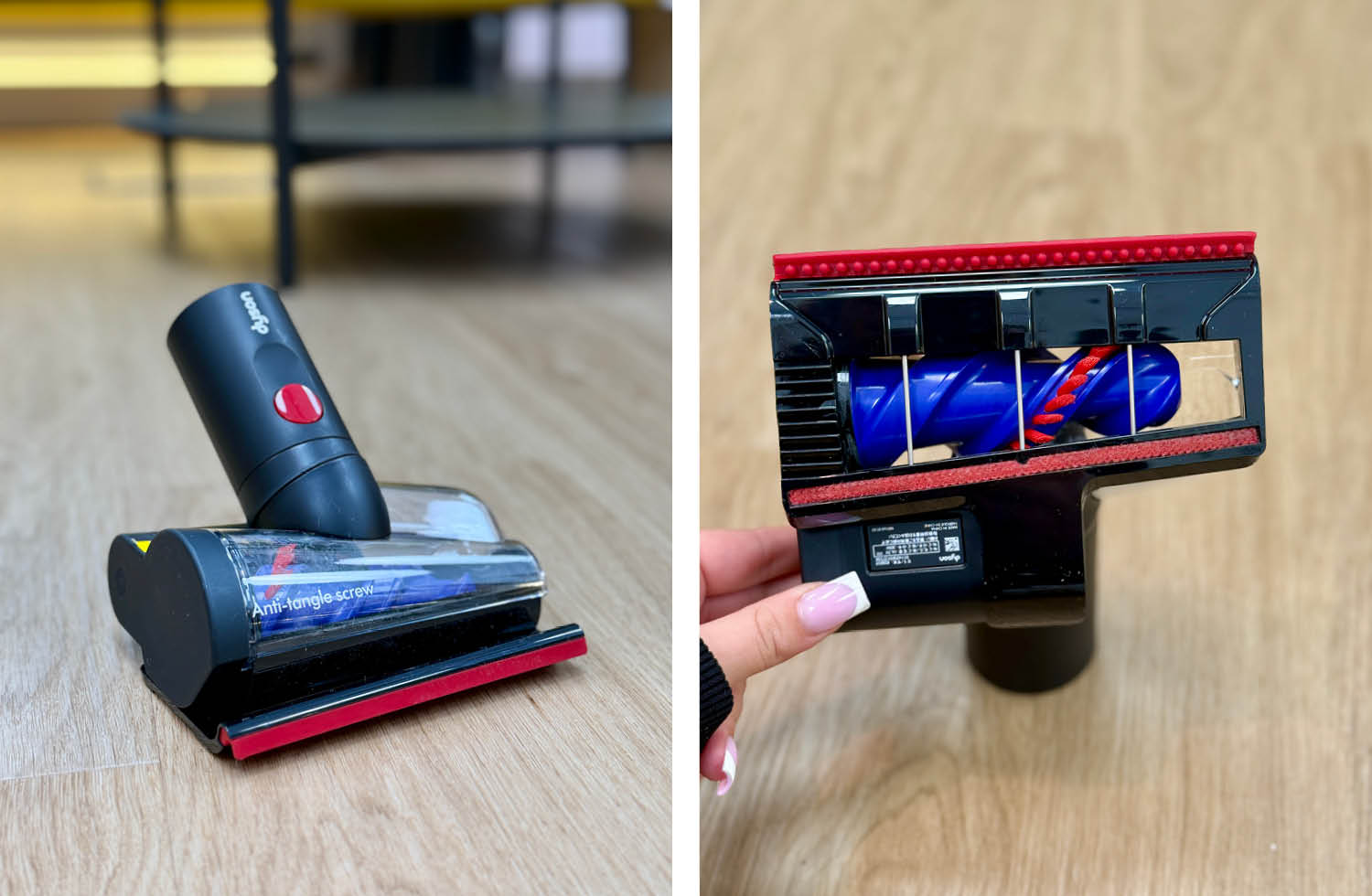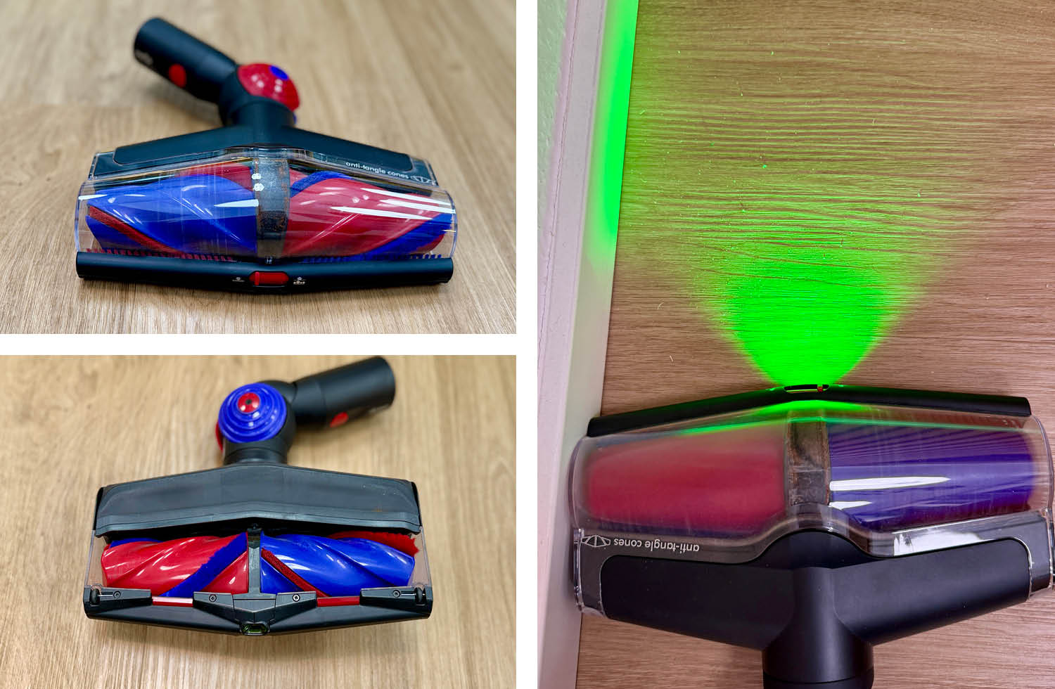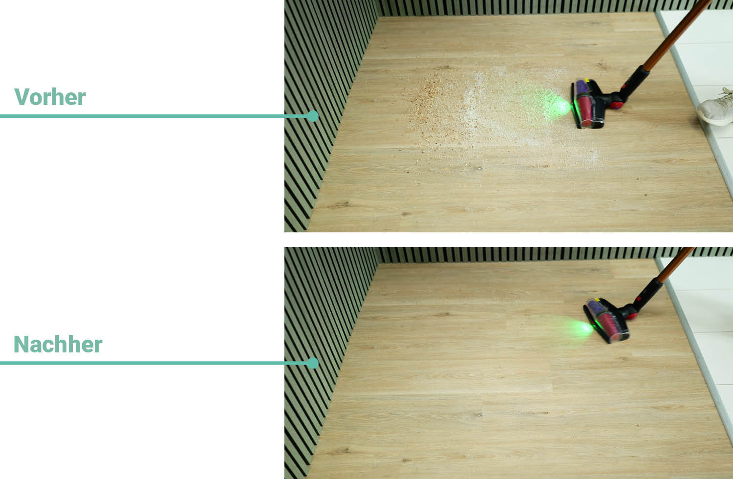 Der wichtigste Aufsatz ist natürlich die motorisierte Hauptbodendüse. Sie funktioniert auf Hartböden und Teppichen gleichermaßen stark. Die konische Bürste verhindert effektiv Haarverhedderungen, während das grüne Partikel-Licht auch feinsten Staub sichtbar macht. Das Ergebnis: gründlichere Reinigung in weniger Zügen.
