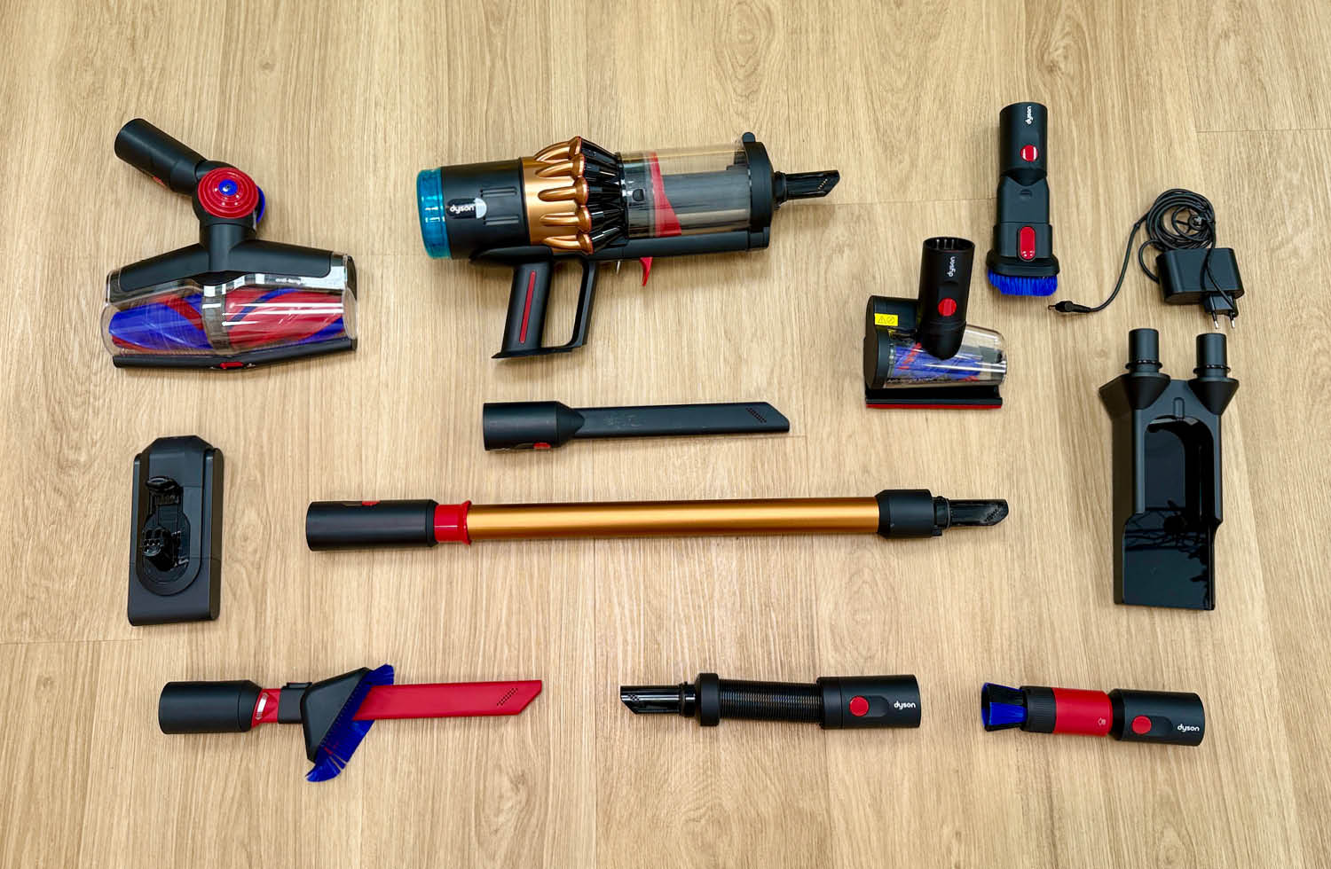 Der Lieferumfang des Dyson V16 Piston Animal fällt großzügig aus und deckt eigentlich jeden Einsatzbereich ab. Neben dem Handteil und dem klassischen Saugrohr liegen mehrere Aufsätze vor: eine Kombibürste, eine Milbenbürste, eine 2-in-1-Kombidüse, eine lange Fugendüse sowie eine drehbare Möbelbürste, ein Flexrohr, eine Wandhalterung und das passende Netzteil. Insgesamt also ein sehr vollständiges Paket, das vielseitige Reinigungsszenarien direkt abdeckt.