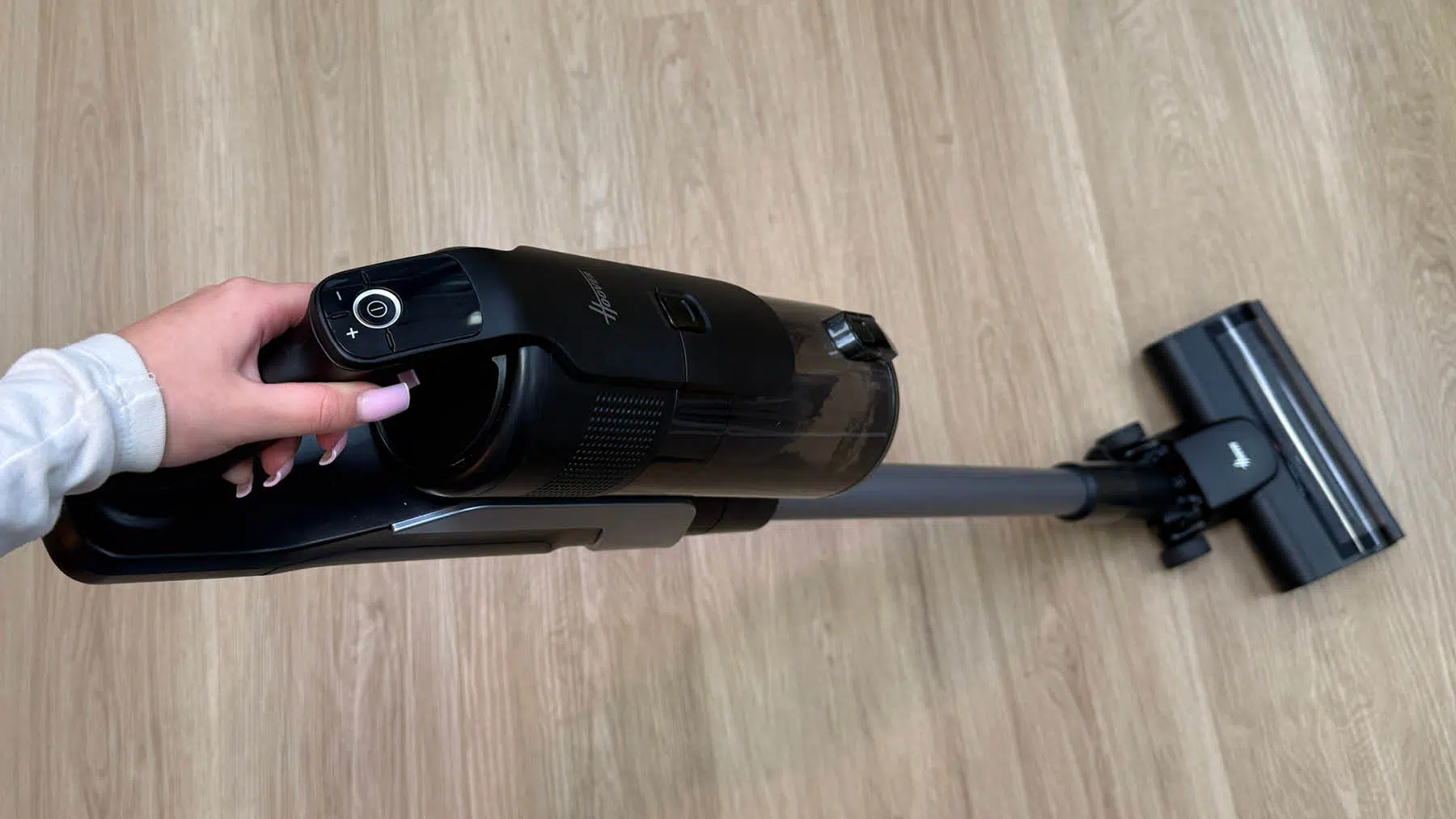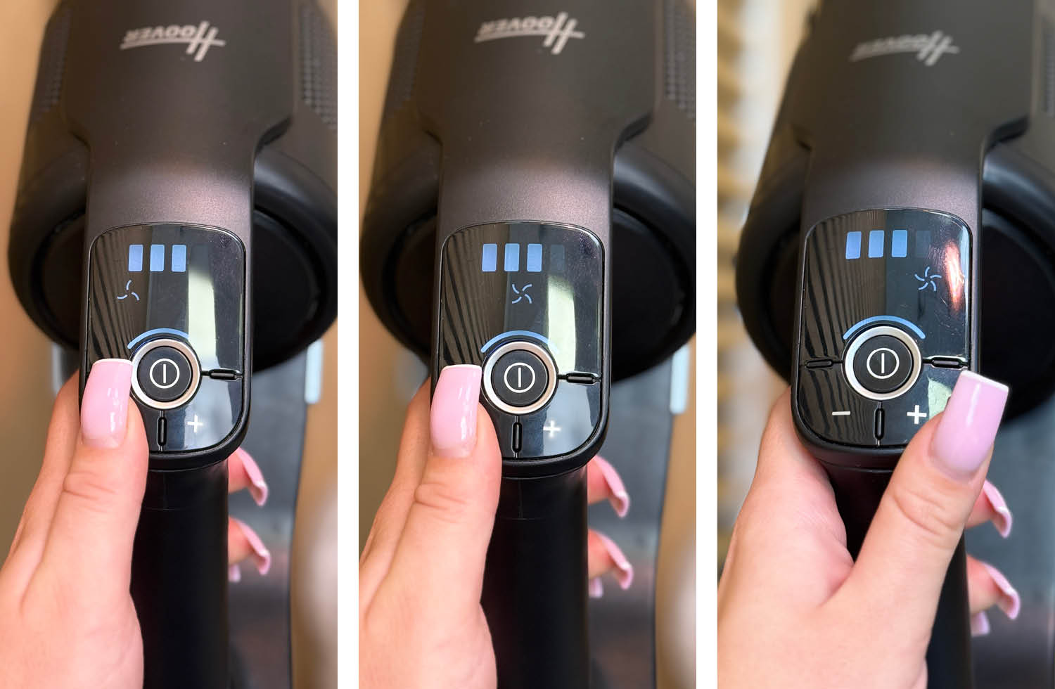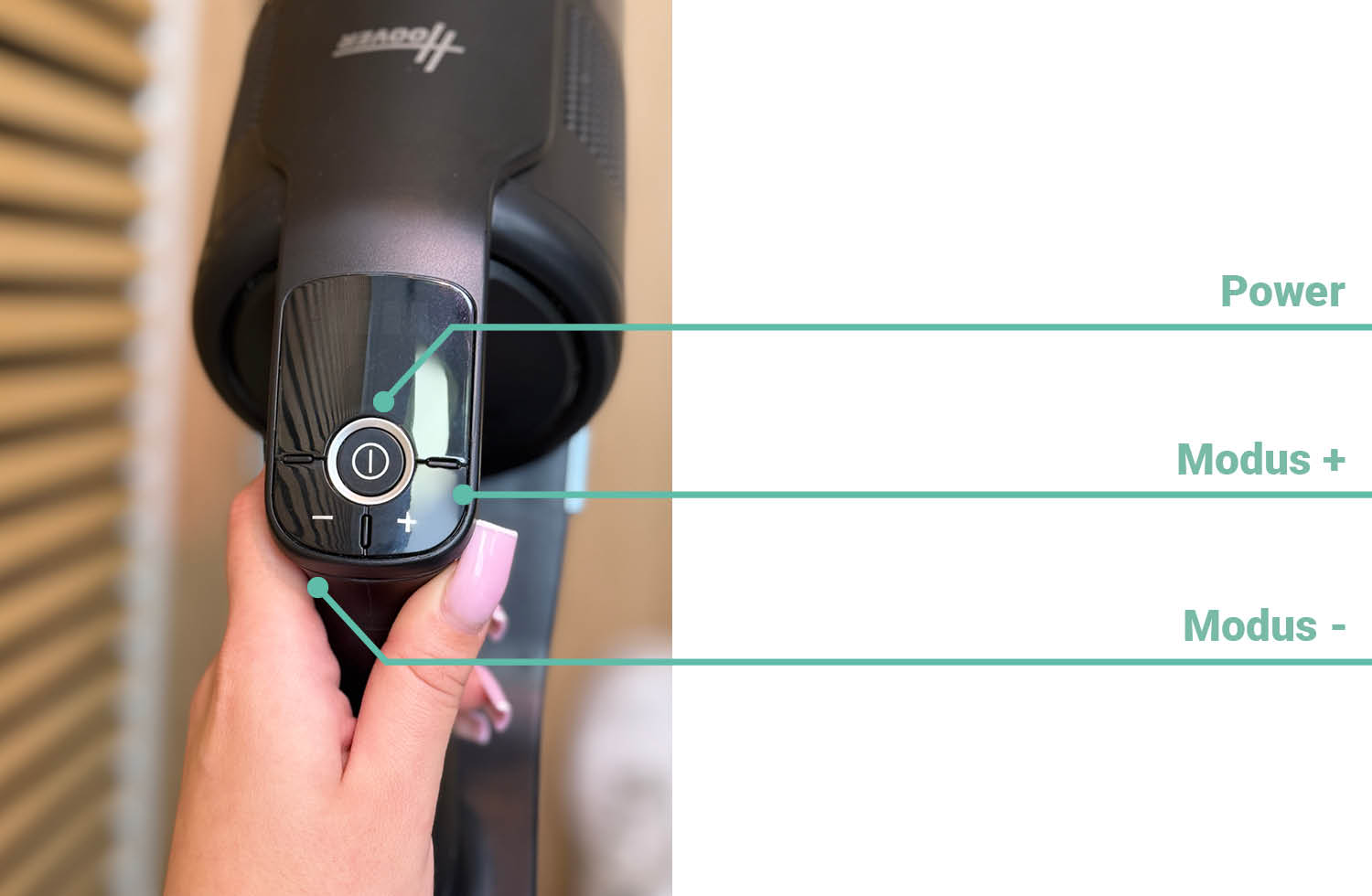 Die Bedienung des Hoover HF6 Home ist angenehm simpel und schnell erlernt. Am Handgriff befinden sich drei Tasten: eine Power-Taste zum Ein- und Ausschalten sowie zwei separate Tasten für die Leistungsstufen. Damit lässt sich direkt zwischen niedriger und starker Saugstufe wechseln, ohne durch Menüs navigieren zu müssen. Insgesamt setzt Hoover hier klar auf eine unkomplizierte Bedienung ohne unnötige Komplexität.