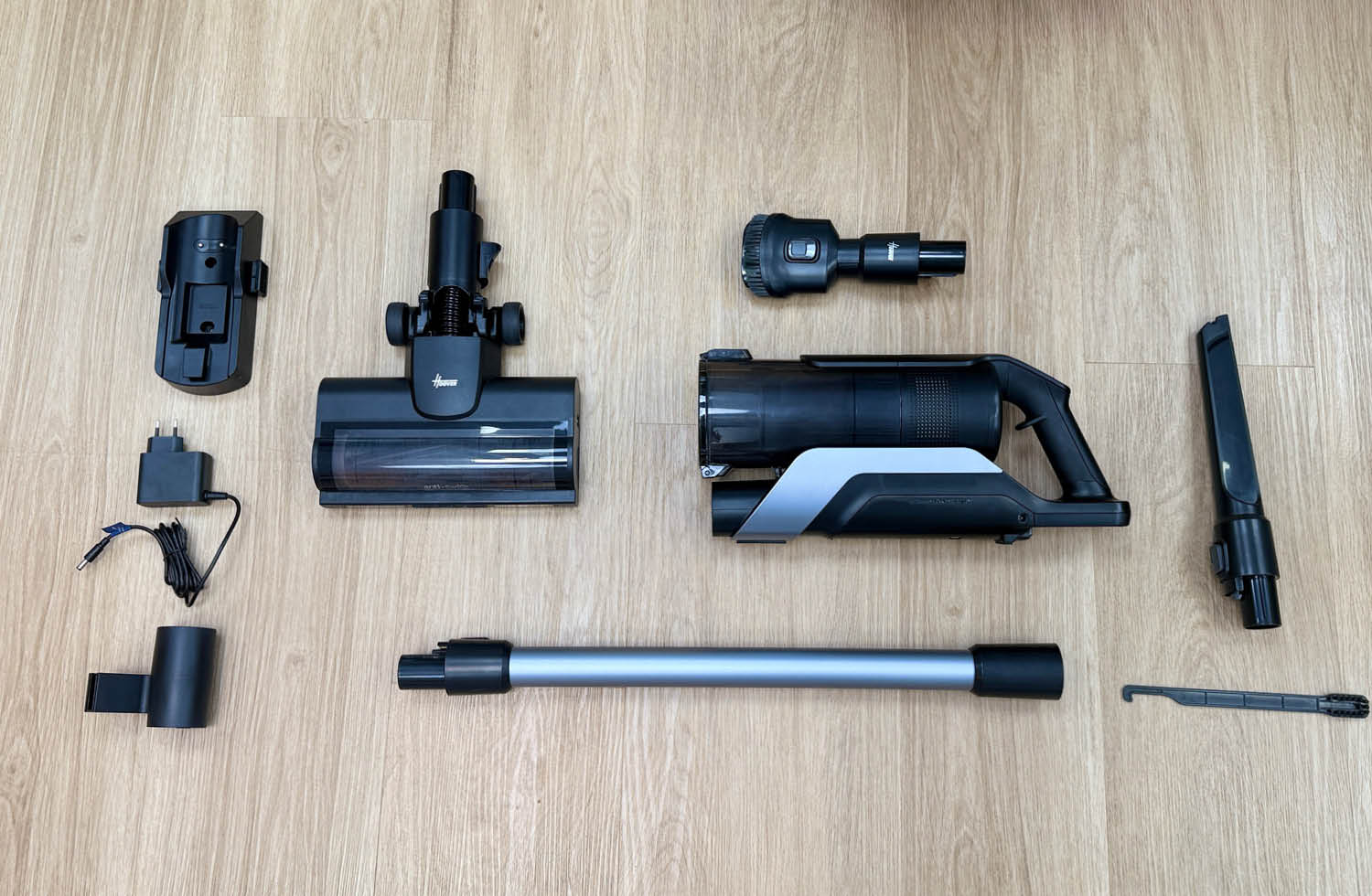 Der Lieferumfang fällt eher überschaubar aus, deckt aber die wichtigsten Basics ab. Im Karton befinden sich der Akkusauger selbst, ein Saugrohr, eine motorisierte Multidüse mit LED-Beleuchtung, eine Fugendüse, eine 2-in-1-Bürste, ein Reinigungstool sowie eine Wandhalterung inklusive Ladegerät und Zubehörhalter. Damit ist alles Nötige für den Start vorhanden, Extras wie zusätzliche motorisierte Düsen oder Zweitakkus sucht man jedoch vergeblich.