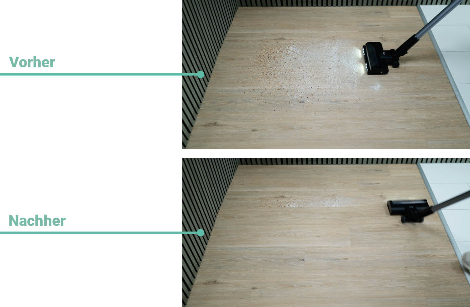 Auf Hartboden erreichte der Hoover HF6 Home eine Saugleistung von 99,33 Gramm, was insgesamt ein solides Ergebnis darstellt. Nach der ersten Überfahrt blieben allerdings noch feine Verschmutzungen auf dem Boden zurück. Diese wurden erst bei der Rückwärtsbewegung vollständig aufgenommen. Für eine wirklich gründliche Reinigung sind somit teilweise mehrere Überfahrten erforderlich, auch wenn das Gesamtergebnis am Ende sauber ausfällt.