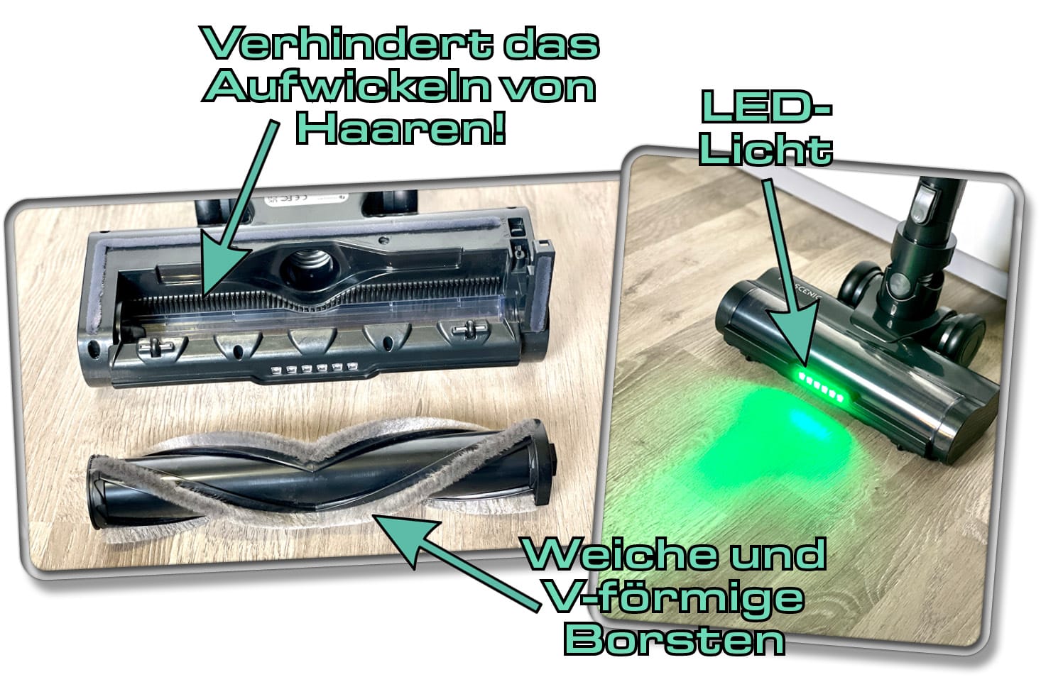 Die mitgelieferte Bodendüse hat gleich mehrere Features mit an Bord. Zum einen, befindet sich an der Kombibürste spezielle Rillen, die ein Aufwickeln von langen Haaren verhindert. Zum anderen besitzt sie ein Licht, das, ähnlich wie bei Dyson, den Schmutz sichtbarer machen soll. Jedoch handelt es sich hierbei lediglich um ein LED-Licht und nicht um ein Laser-Licht wie bei Dyson.
