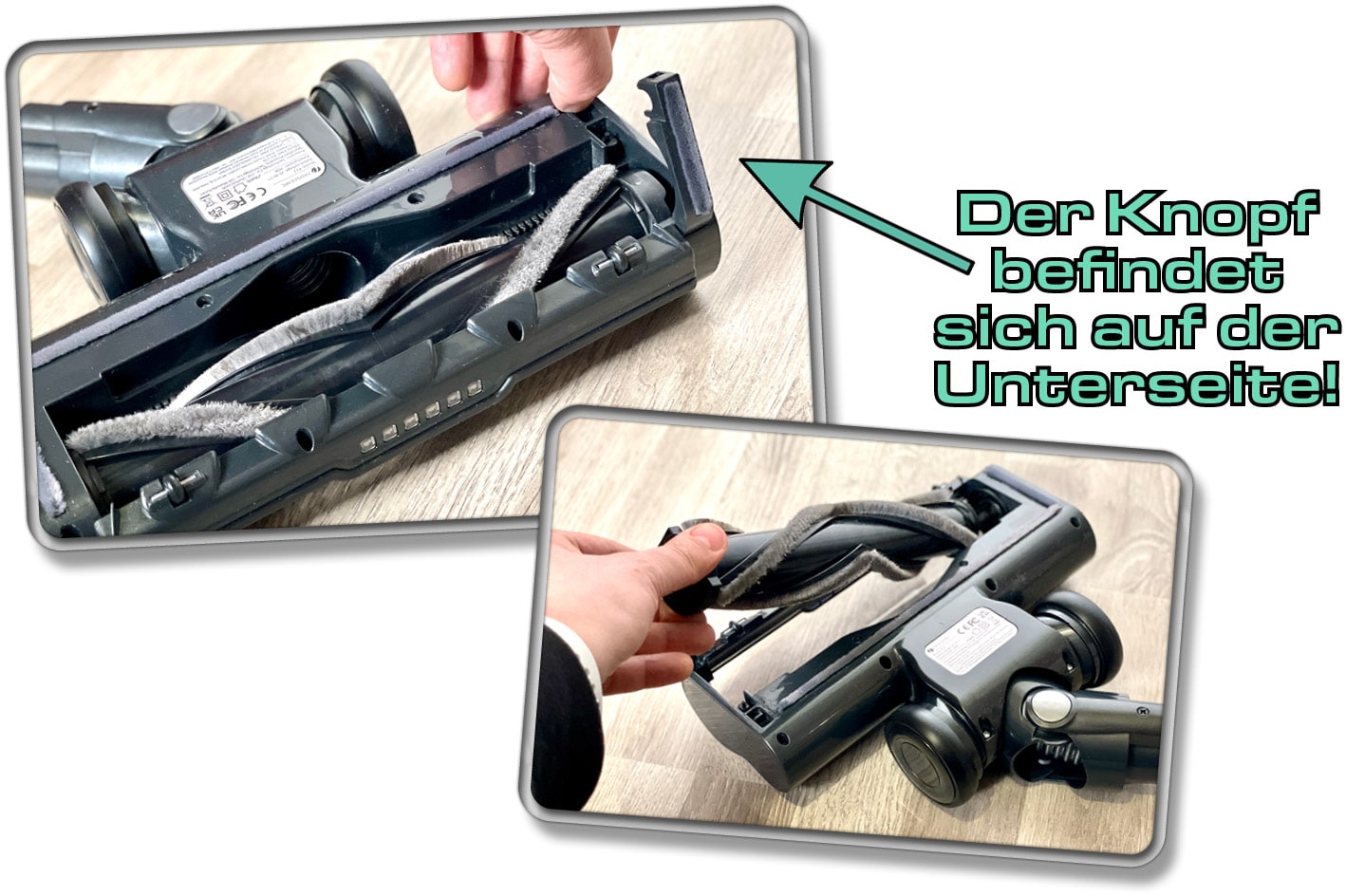 Die Kombibürste kann einfach entnommen werden, jedoch muss die Düse dabei umgedreht werden. Der Öffnungsmechanismus ist nämlich auf der Unterseite, in Form eines kleinen Schalters, angebracht. Ebenfalls wird die motorisierte Bürste von unten herausgenommen.