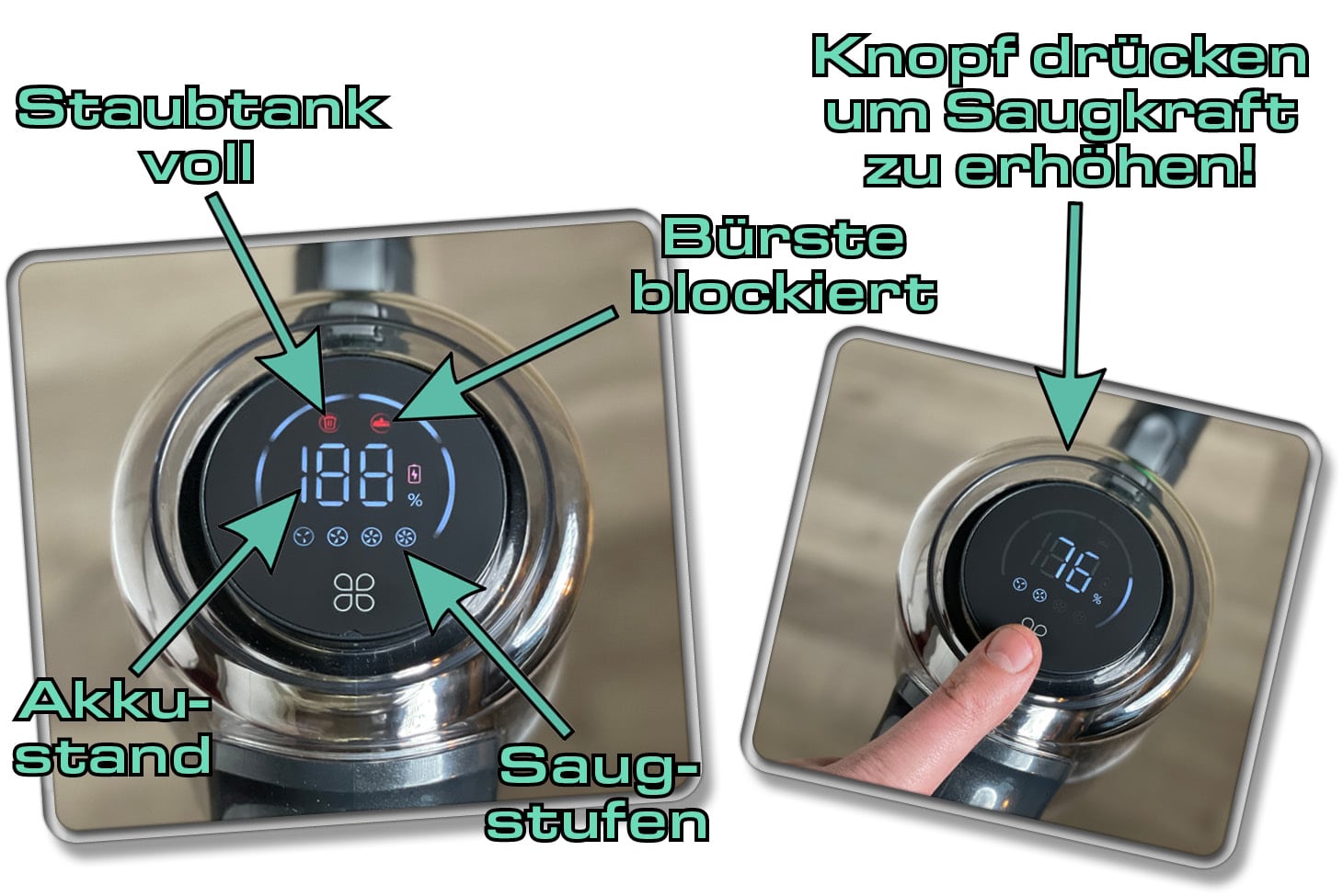 Neben den genannten Anzeigen und Funktionen bietet dir das Display in roter Beleuchtung zusätzlich eine Anzeige, wenn die Bodenbürste blockiert ist oder der Staubbehälter entleert werden muss.