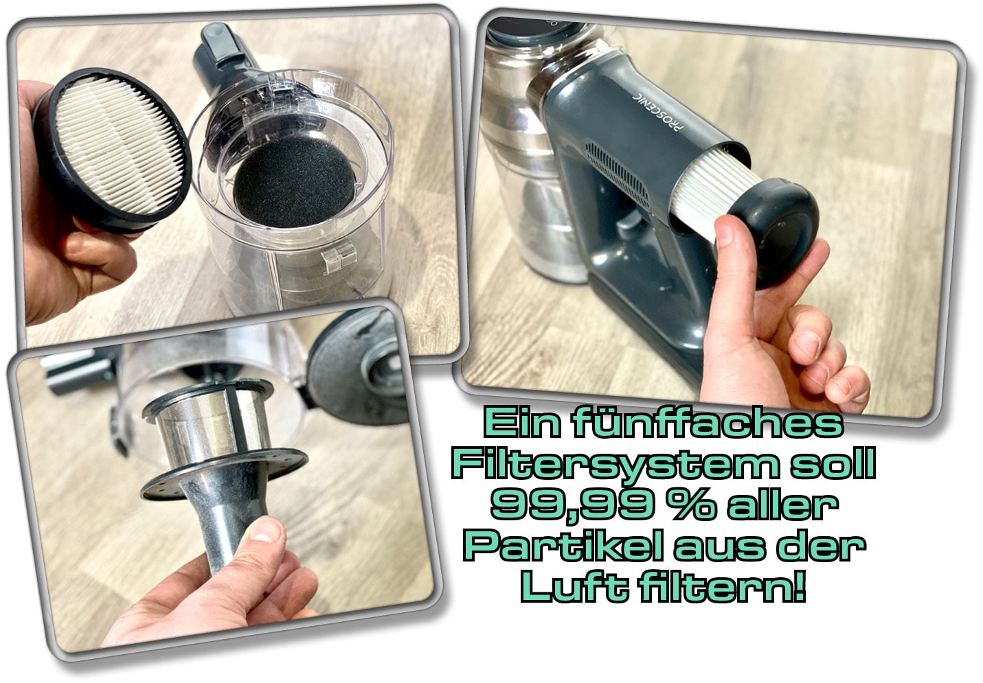 Proscenic wirbt beim P12 für eine gute Filterleistung. Dafür ist ein fünffaches Filtersystem verbaut worden. Der Akkusauger besitzt eine Zyklontechnologie, die den Staub von groben Verschmutzungen trennt und durch ein Edelstahl-Mesh-Gitter drückt. Danach muss dieser durch einen Schwammfilter und durch einen ersten HEPA-Filter. Am Luftauslass befindet sich ebenso ein weiterer HEPA-Filter, damit wirklich nichts an Luftverschmutzung mehr entweichen kann. So verspricht das Unternehmen, dass 99,99 Prozent aller Staubpartikel aus der Luft gefiltert werden.