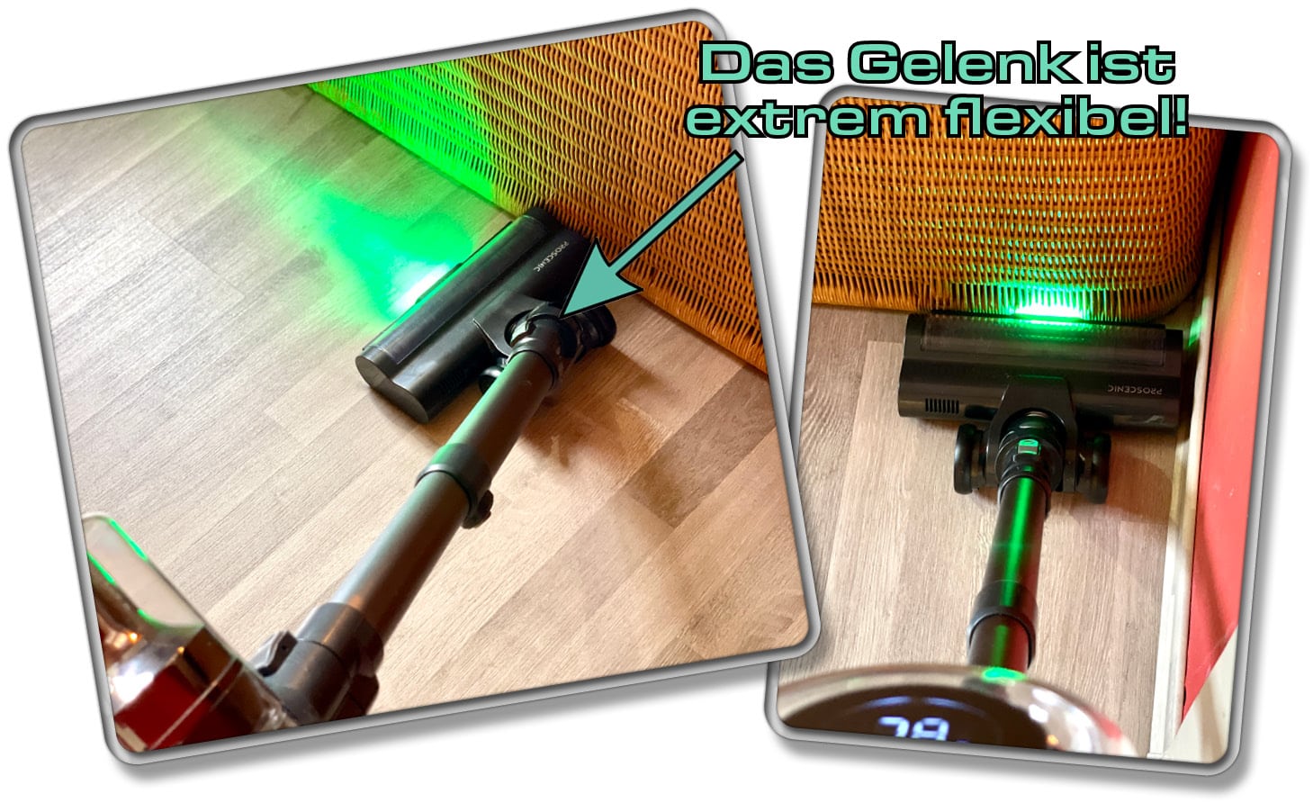 Die Bodenbürste kommt nicht ganz an den Rand, was jedoch weniger schlimm ist, da die Saugkraft jeglichen Schmutz auch dort entfernt. Eine Freisehfunktion besitzt der Proscenic P12 nicht. So muss er jedes Mal abgelegt oder in die Wandhalterung eingesetzt werden, wenn es beispielsweise an der Tür klingelt. Das flexible Gelenk an der Bodendüse kann bis zu 180 Grad gedreht werden und zeigte im Test wirklich gute Flexibilität. Die Führung des Saugers ist dabei unkompliziert und schön.