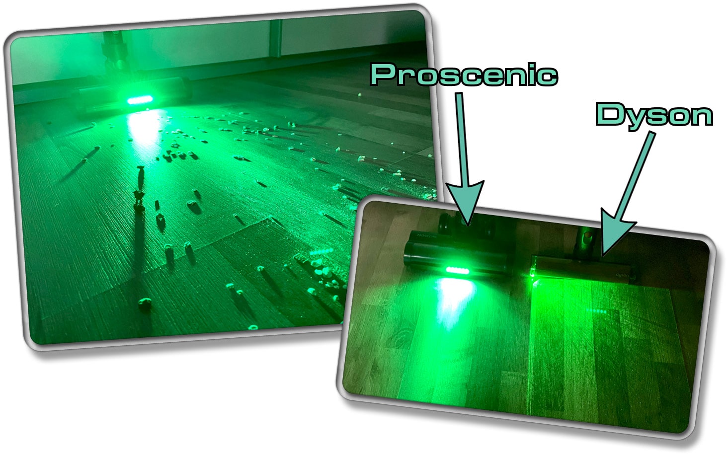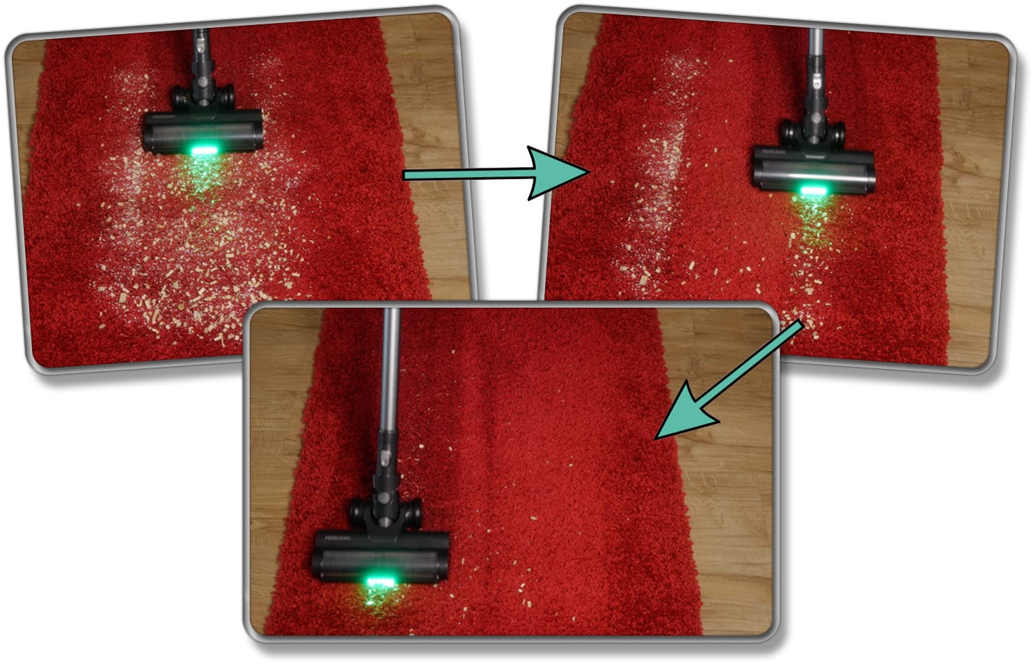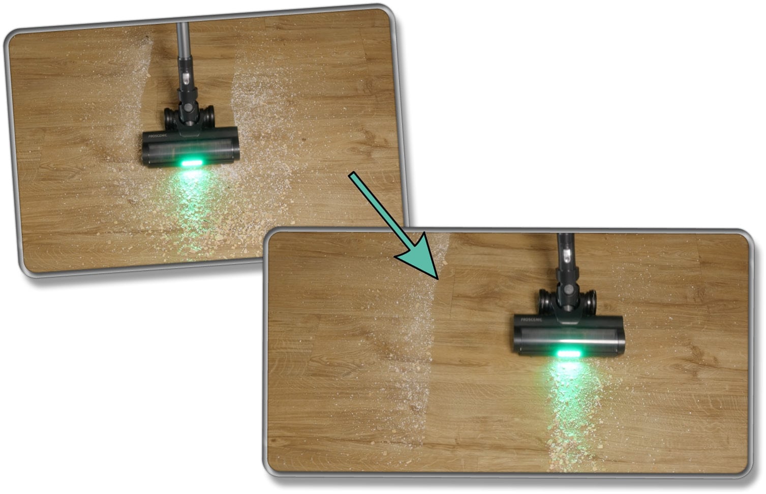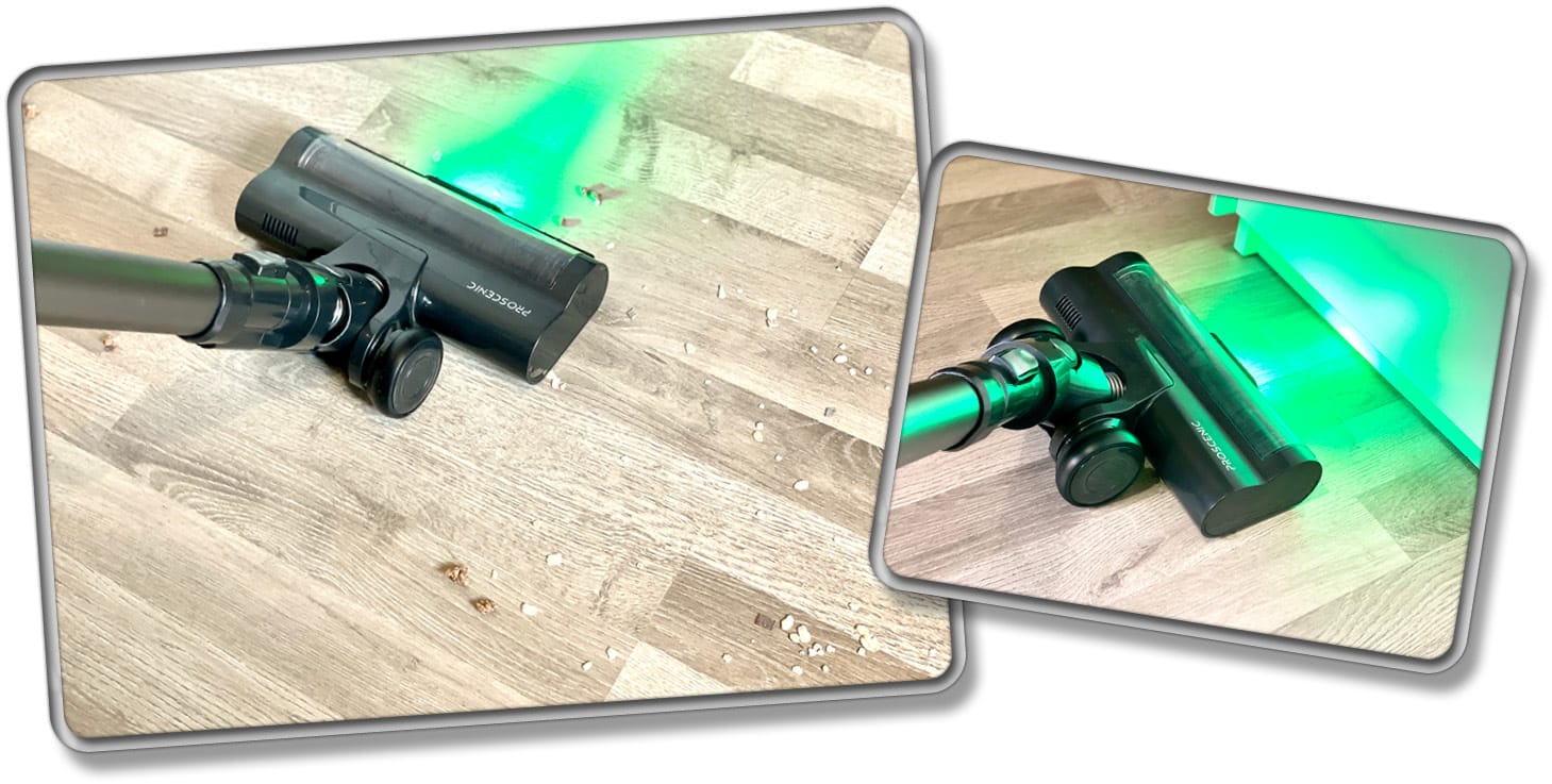 Das Vertect-Licht an der Vorderseite der Bürste zeigt tatsächlich gut an, wo der feinste Schmutz versteckt ist. Zwar wird aus feinen Partikeln kein großer Berg, wie bei den Dysons, dennoch wird dieser deutlich ersichtlicher als ohne das Licht. Somit ist das Vertect-Licht am Proscenic P12 eine praktische Hilfe, aber deutlich heller und somit nicht so präzise wie die Dyson-Technologie.