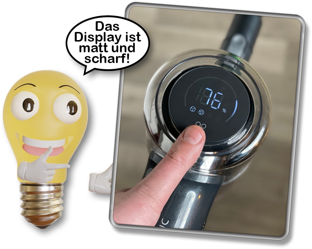 Auf der Oberseite befindet sich ein mattes LED-Display, dass dir beim Saugen nicht nur die Saugstufen anzeigt, sondern auch, wenn die Bürste blockiert ist oder der Staubtank entleert werden muss.