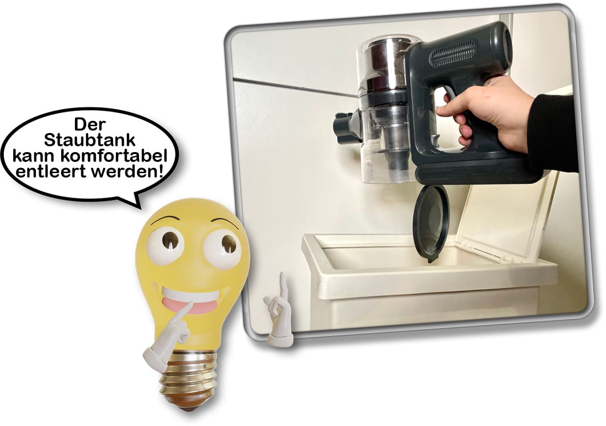 Der Staubtank des Proscenic P12 kann gleich auf zwei verschiedene Art und Weißen entleert werden. Zum einen kann das Zubehör abgenommen und der komplette Akkusauger mittels Taste über dem Mülleimer geöffnet werden. Dabei öffnet sich eine Klappe an der Unterseite des Behälters, aus dem der Schmutz herausfällt.