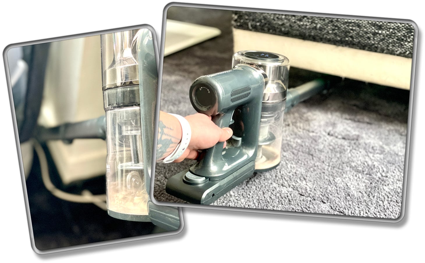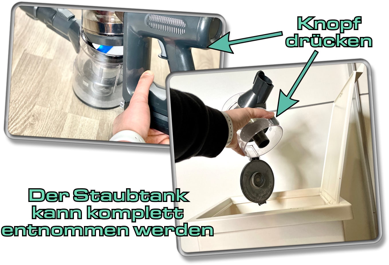 Eine weitere Möglichkeit ist das komplette Abnehmen des Staubtanks. Auch das lässt sich über einen einzigen Klick realisieren. Da das Zubehör oder Saugrohr am Staubtank befestigt ist, muss dieses im Vorfeld abgenommen werden. Das Wiederaufsetzen des Staubtanks ist etwas fummelig.