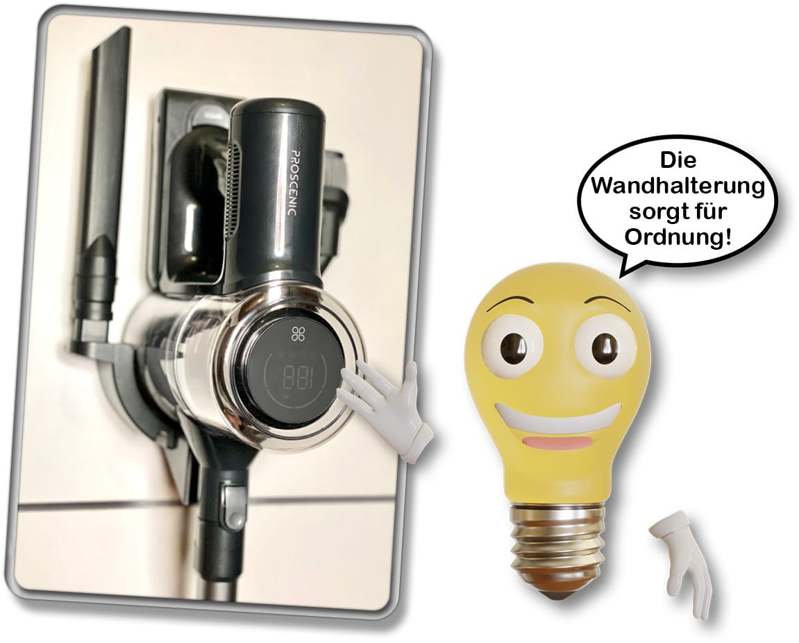 Des Weiteren liegt dem Lieferumfang eine Wandhalterung bei, die ein komfortables Verstauen des Akkusaugers ermöglicht. Jedoch lädt diese nicht automatisch den Proscenic P12 beim Einsetzen auf, sondern das mitgelieferte Netzkabel muss manuell angeschlossen werden. Die Wandhalterung verfügt zudem über praktische Zubehörhalterungen.