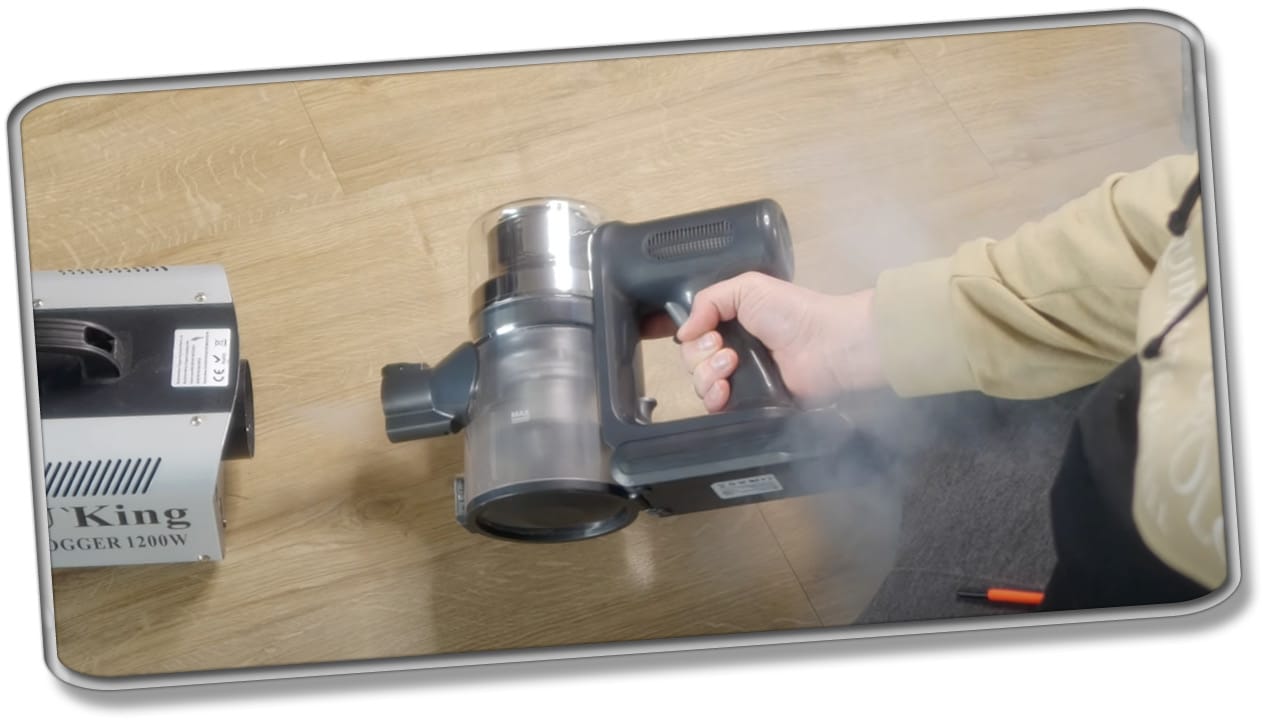 In der Praxis jedoch sieht die Sache anders aus. Auch der Proscenic P12 muss durch unseren Filtertest, den wir mit einer Nebelmaschine anschaulich darstellen. Der Sauger muss den Nebel einsaugen und es darf kein Rauch irgendwo mehr herauskommen. Das schaffen die meisten High-End-Geräte recht gut, doch schafft das auch der Proscenic P12? Trotz 5-fach-Filterung tritt beim Test an manchen Stellen Nebel aus. Somit hat er nicht die Filterleistung, die wir uns erhofft haben. Zwar ist der Austritt geringer als bei anderen Modellen, jedoch ist er da. Unser Filtertest ist somit nicht bestanden.