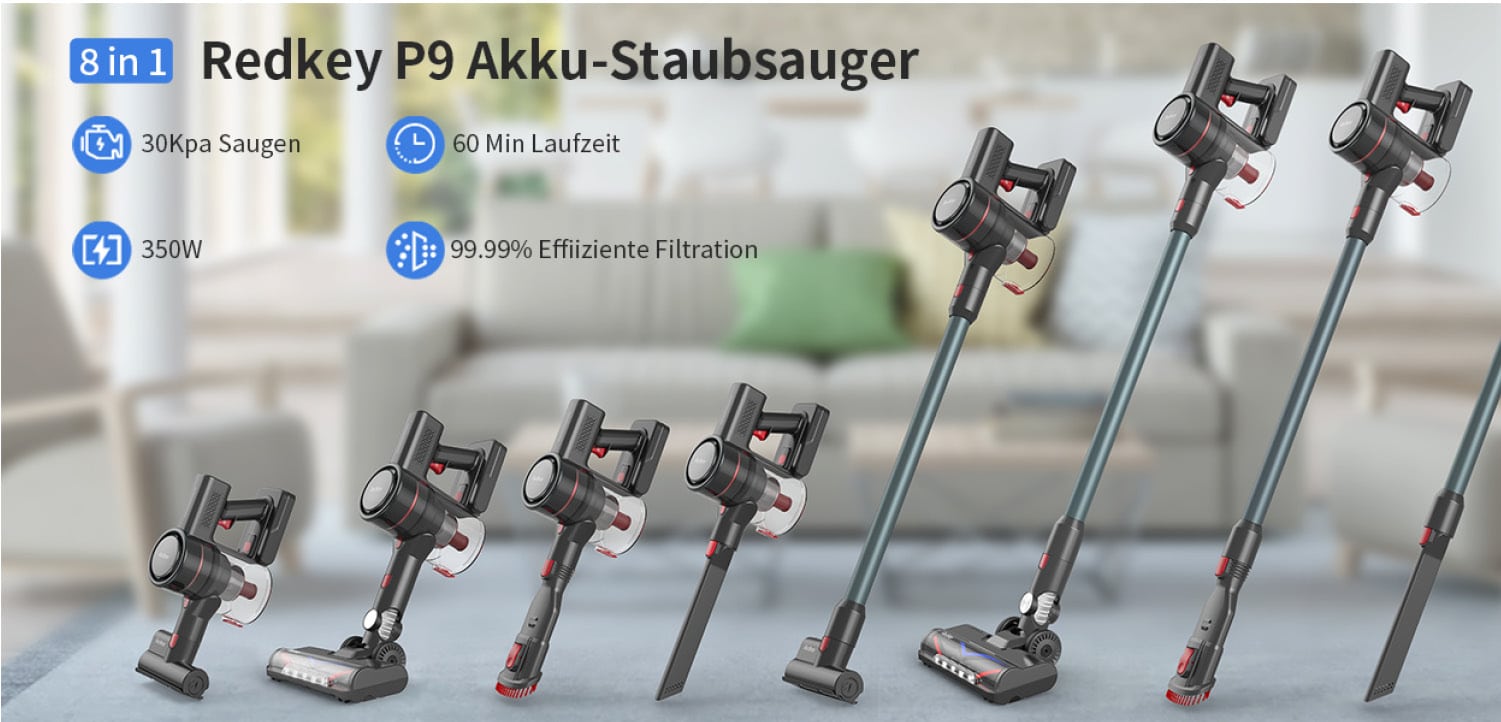 Mit einem 2600 mAh starken Akku hält der Redkey P9 im kleinsten Modus ganze 60 Minuten durch, bevor er wieder aufgeladen werden muss. Er verfügt über stolze 30.000 Pascal Saugleistung und einem 600 ml großen Staubtank, der ohne Beutel schnell geleert ist.