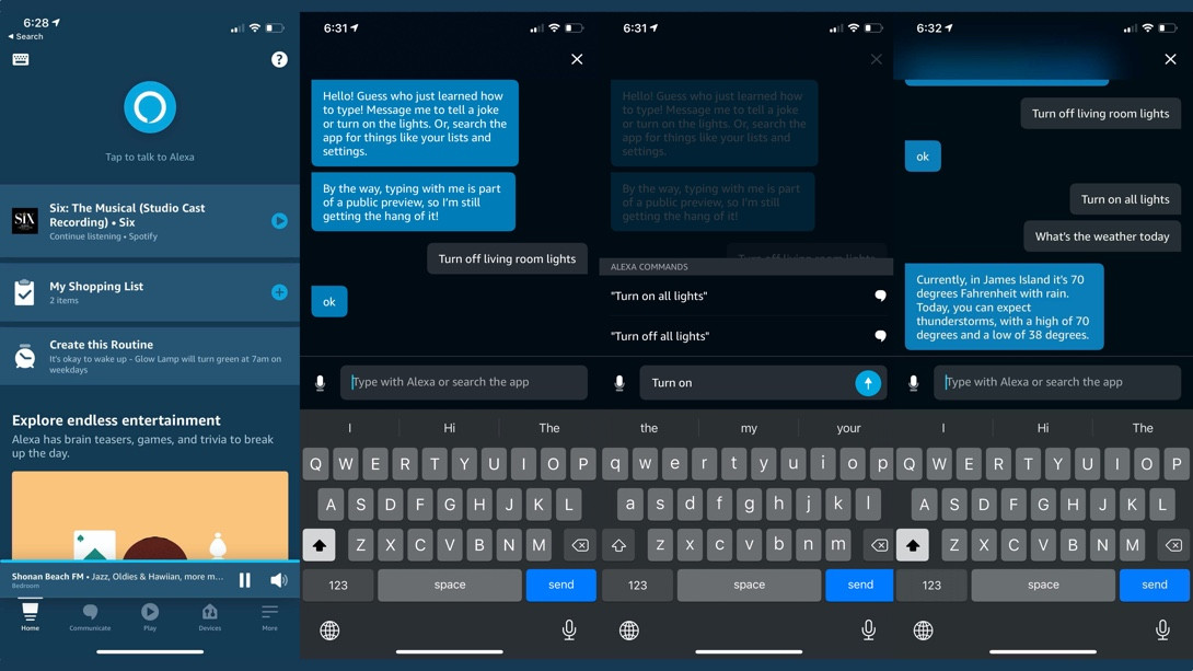 Meiner Meinung nach ein ziemlich cooles Feature. So kann man zum Beispiel Alexa per Text den Befehl geben das Licht auszuschalten, wenn dies per Sprache grade nicht möglich ist.