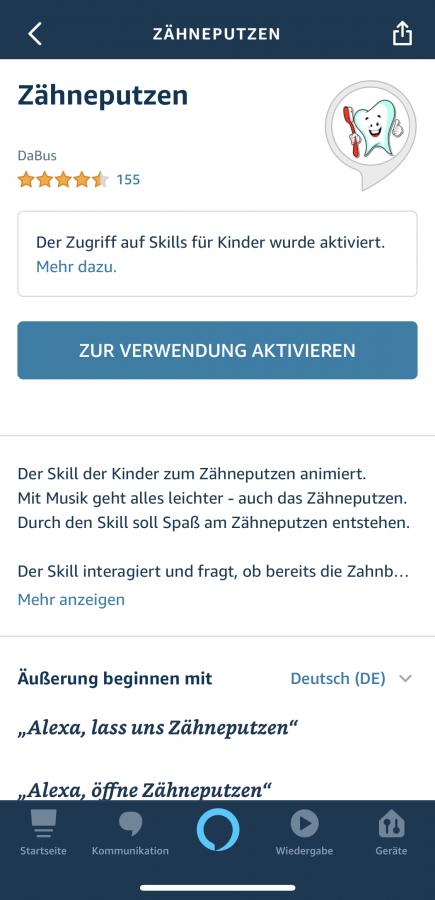 Skills, die keine Login-Daten benötigen, können auch einfach per Sprachbefehl aktiviert werden. Wisst Ihr also bereits, welcher Skill aktiviert werden soll, könnt Ihr Euch den Weg über die Alexa App sparen. Sagt dann einfach: „Alexa, aktiviere den Skill Zähneputzen!“ (als Beispiel) und der Skill wird aktiviert. Bei den meisten Skills werden direkt die Informationen zur Verwendung des Skills von Alexa vorgelesen.