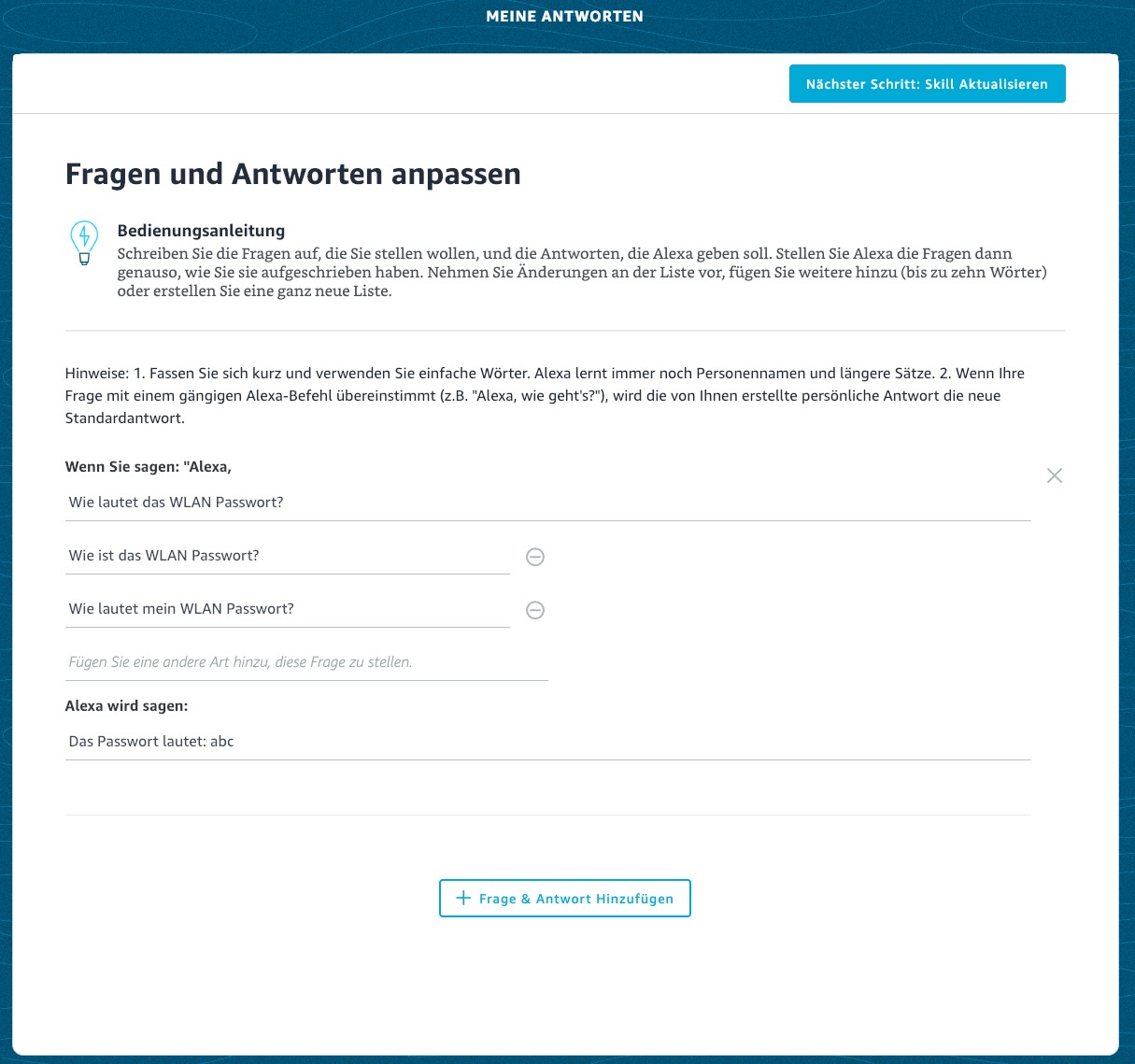 Erstellt ihr zum Beispiel die Frage: „Alexa, wie lautet mein Wlan-Gast Passwort?“ und hinterlegt als Antwort „Dein Wlan Gast-Passwort lautet: 123xyz“, bekommt ihr dieses dann nach Erstellung des Skills auch so ausgegeben.