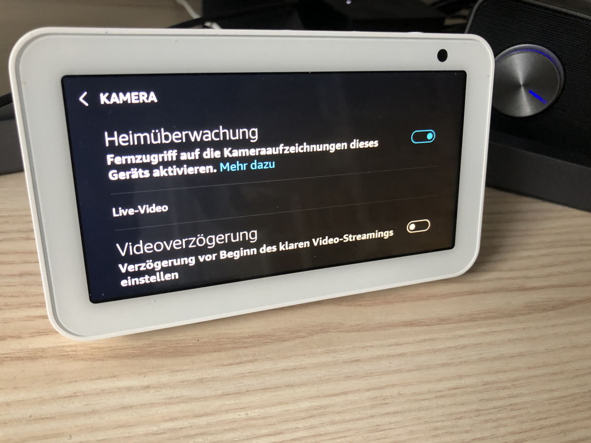 Gehe an deinen Echo Show und wische mit dem Finger vom oberen Bildschirmrand nach unten. Hier kommst du in die Einstellungen. Suche nach dem Menüpunkt „Kamera“. Hier drin solltest du den Punkt „Heimüberwachung“ finden und aktivieren können.