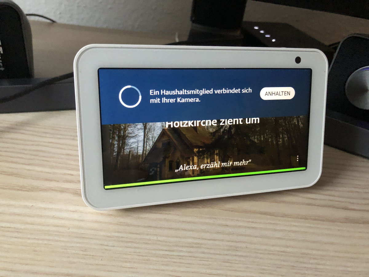 Bei der Heimüberwachung lassen sich das verschwommene Bild und ein Signalton optional auch einstellen, im Standard kann man sich hier aber lautlos aufschalten. Das Mikrofon und die eigene Kamera sind deaktiviert. Einen Hinweis zur Verbindung auf dem Display erscheint jedoch immer. Zusätzlich signalisiert ein grüner Streifen am unteren Rand die offene Verbindung. Da die Heimüberwachung ein Stream ist, kannst du diesen gleichzeitig auf dem Mobiltelefon und weiteren Echo Geräten mit Alexa ansehen.