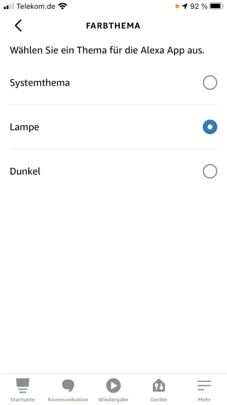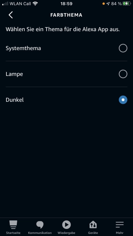 Die Einstellung findest du in der Alexa App unter „Einstellungen“ – „Alexa-App-Einstellungen“ – „Farbthema“.