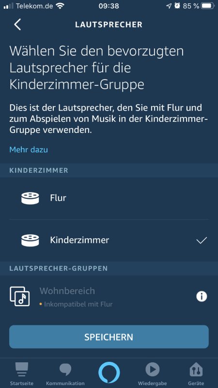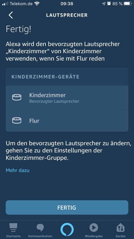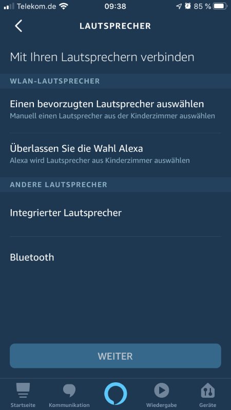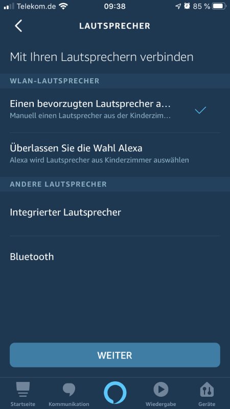 Um einen kompatiblen WLAN-Lautsprecher oder einen Amazon Echo als bevorzugten Lautsprecher für die Ausgabe des Ton zu definieren, gehst du in der Alexa App auf Menu -> Einstellungen/Geräteeinstellungen, Echo auswählen -> Lautsprecher.