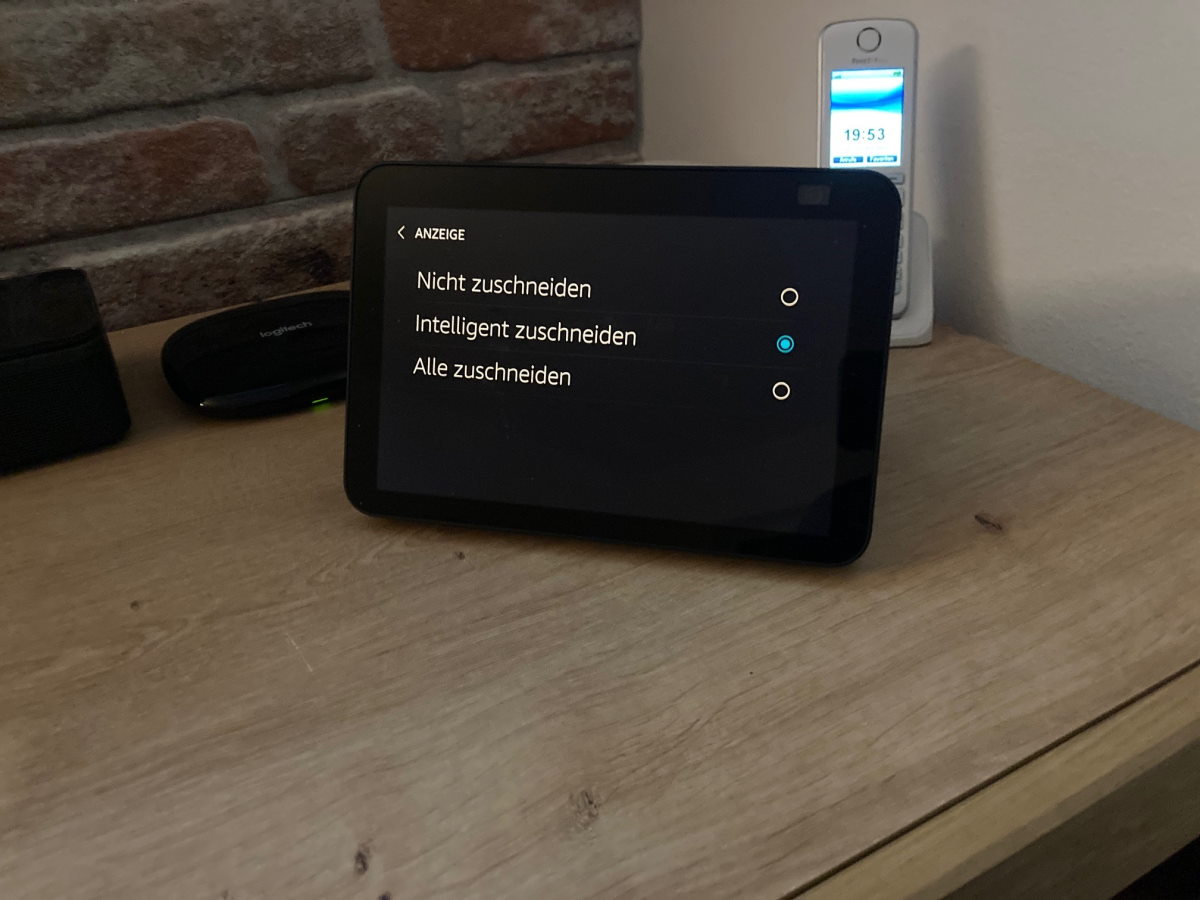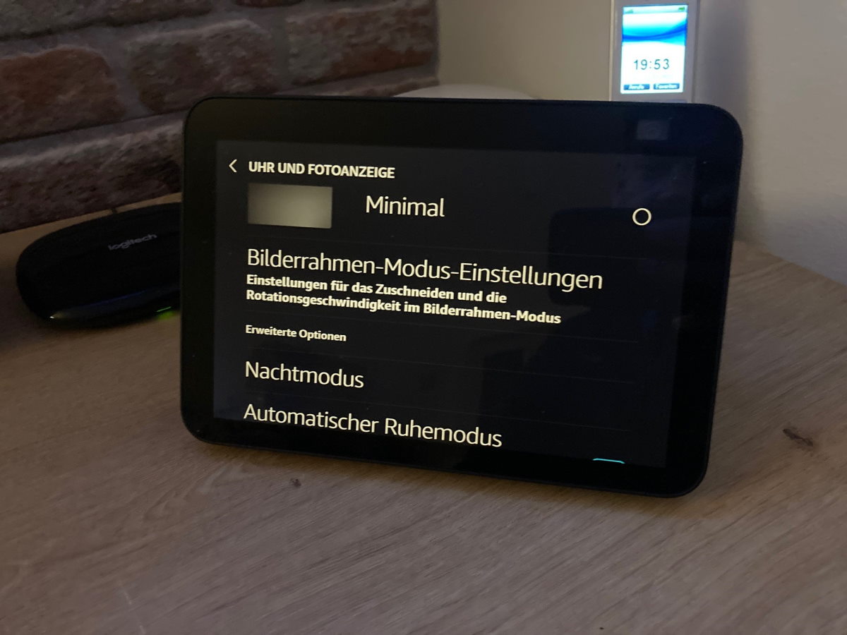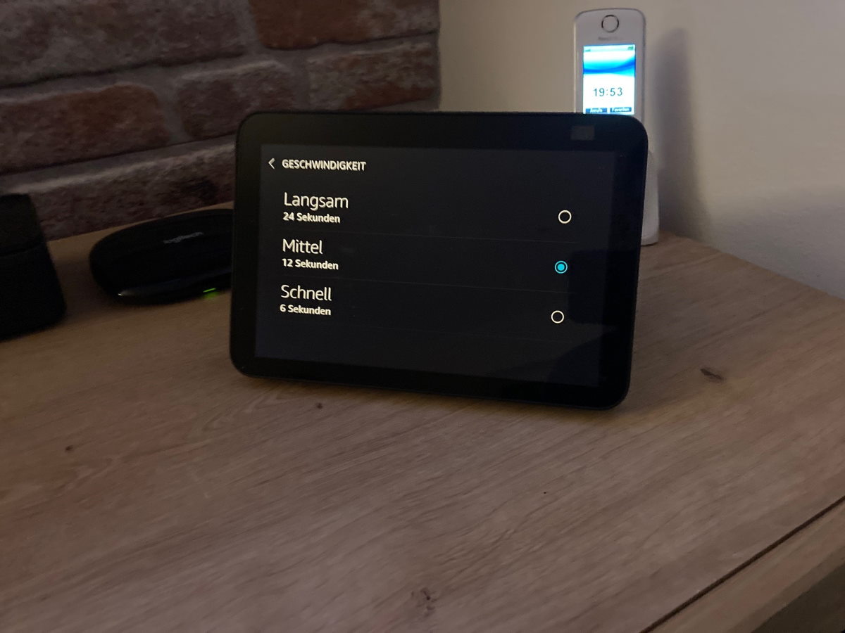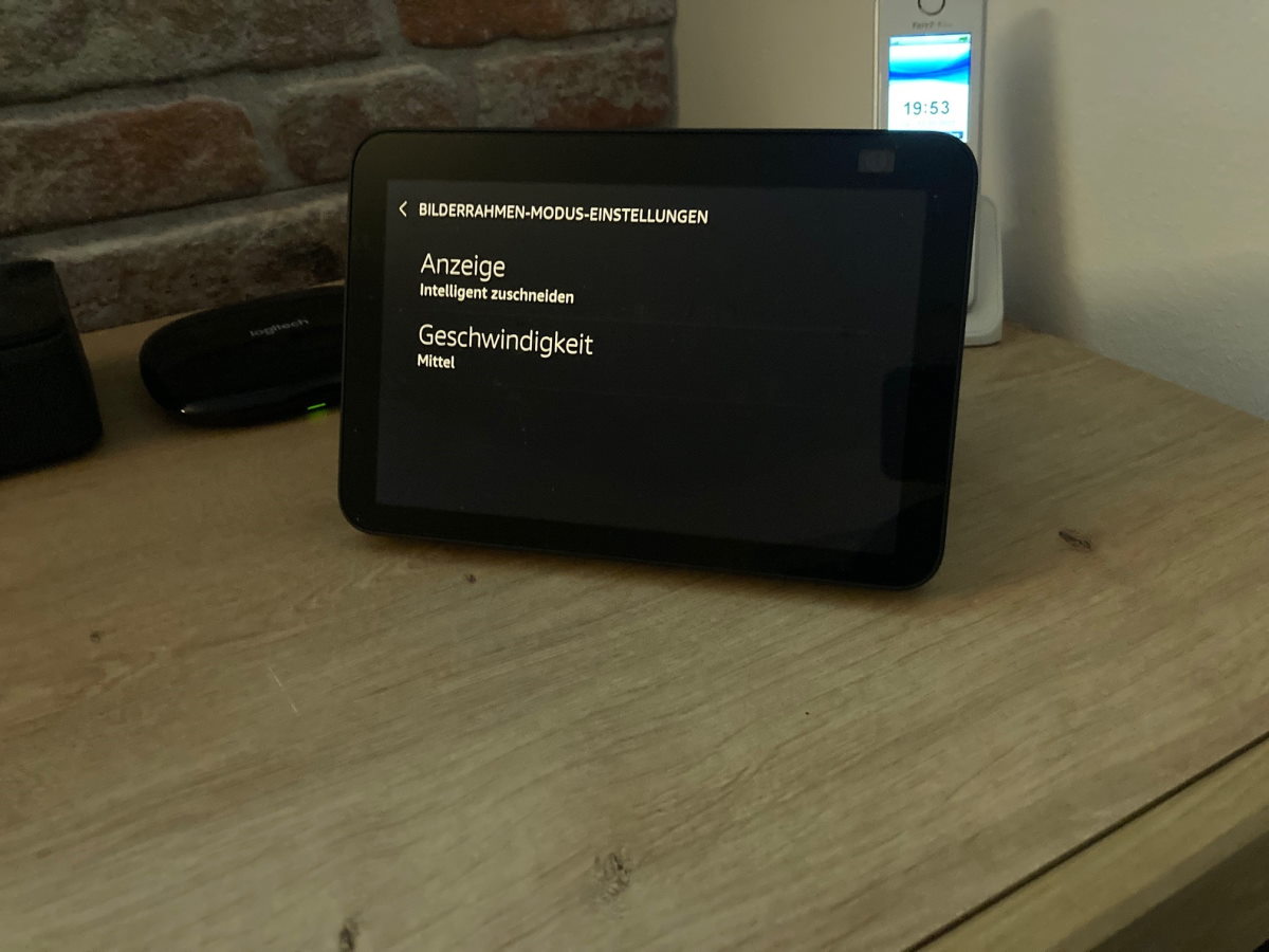Ein weiterer Punkt ist der Bilderrahmen-Modus. Hier lassen sich Einstellungen vornehmen, wie sich das Gerät im Bilderrahmen-Modus verhalten soll. Ob das wirklich an den Echo Show 8 adressiert ist? Es lassen sich bis zu 3 Geschwindigkeiten einstellen und es kann entschieden werden, ob und wie die Bilder zugeschnitten werden sollen.