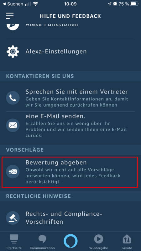 Nun bin ich selbst betroffen, allerdings nicht mit einem Smarthome-Gerät, sondern offenbar mit einem Amazon Alexa Gerät (Amazon Echo?). Beginnen wir aber mal von vorn… Ich prüfe regelmäßig in der Alexa App, ob es neue Funktionen gibt, um natürlich hier auf der Seite darüber zu berichten. Dazu gehört auch die Geräteliste, um eventuell neue Einstellungen für einzelne Gerätetypen zu finden. Hier konnte ich auch keine besonderen Auffälligkeiten feststellen. Eher seltener prüfe ich jedoch den Bereich „Hilfe und Feedback“, und genau hier wurde ich fündig!