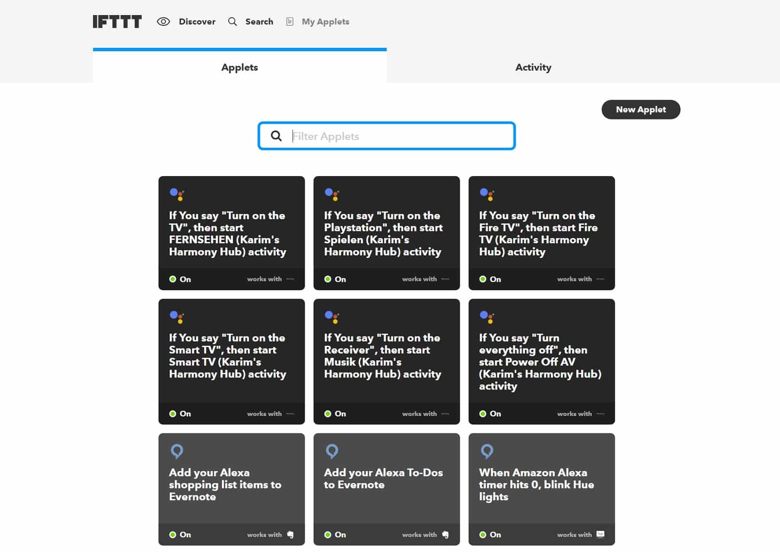 Wenn ihr dann mindestens 2 Services mit IFTTT verknüpft habt, geht es mit den Applets weiter. Sie sind die „Rezepte“ die dann für die Zusammenarbeit der Services sorgen. Weiter unten erkläre ich euch dann genau, wie das funktioniert.