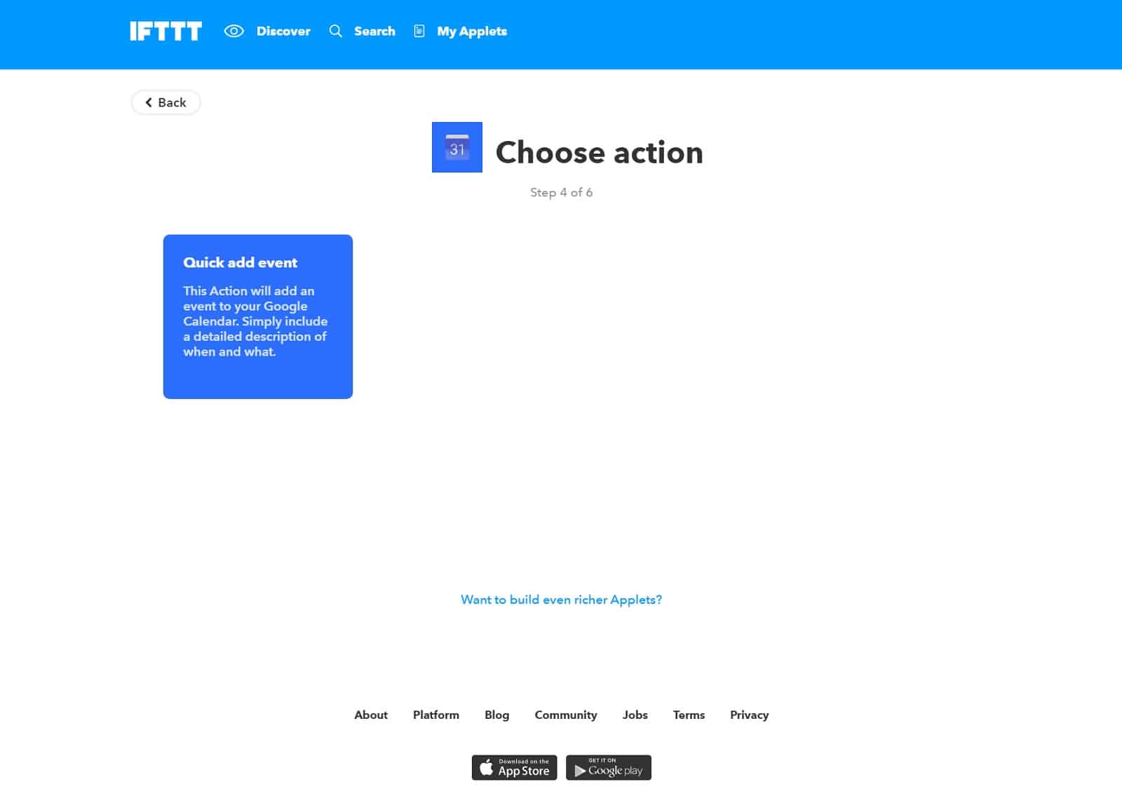 - Jetzt entscheidet ihr euch wieder für einen weiteren Service bzw. eine Action die ausgeführt werden soll. Ich habe dort den Google Calendar ausgewählt und unten rechts das Symbol angeklickt.