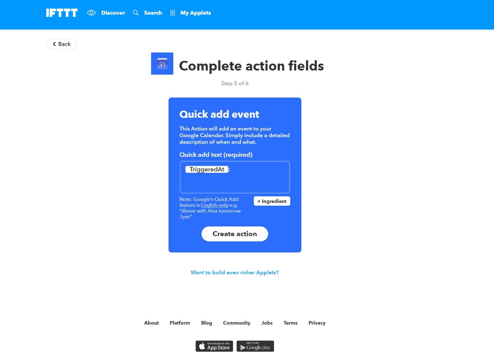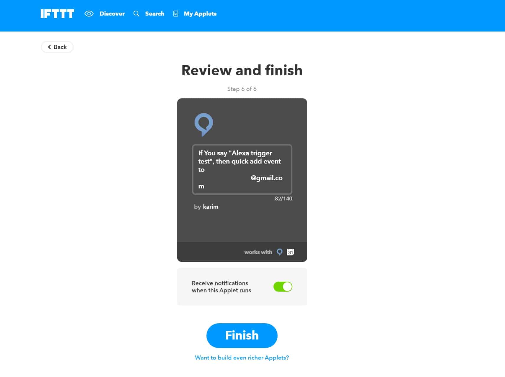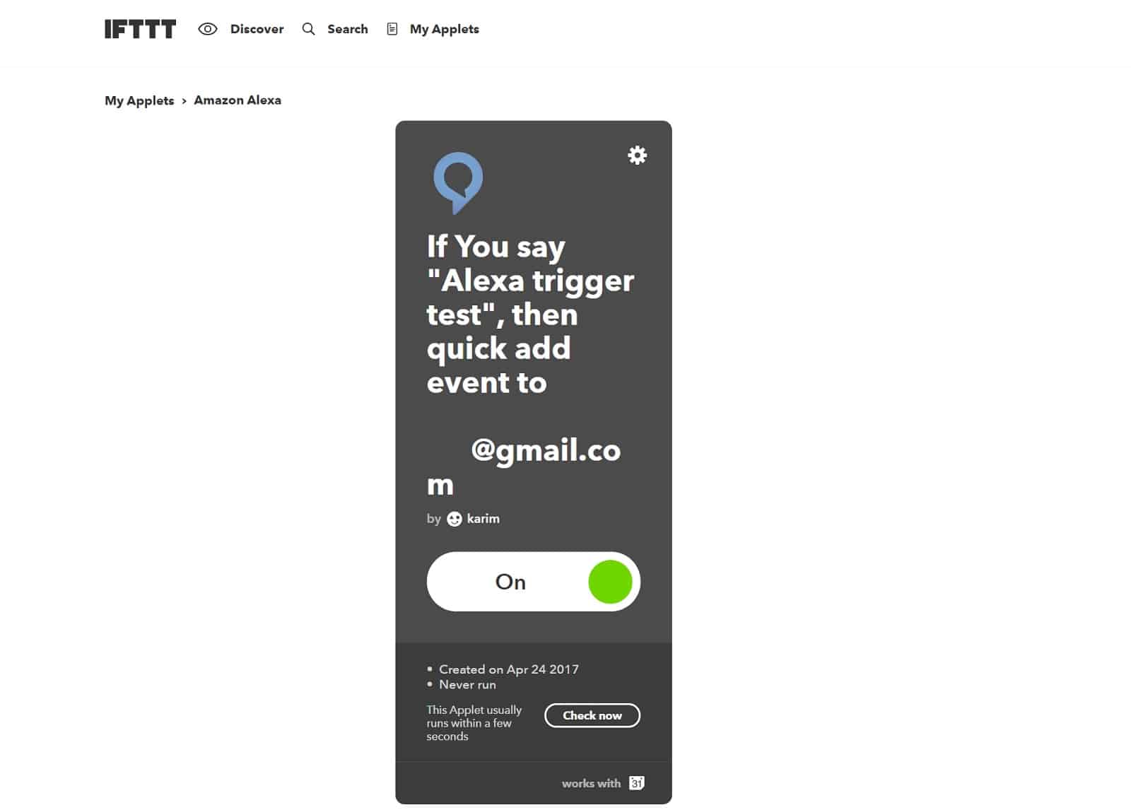 Hier gehe ich nun kurz auf jeden Screenshot ein. Am Ende haben wir ein Applet erstellt, was einen Eintrag in eurem Google Calendar erzeugt. Als Wert wird der Zeitpunkt eingetragen, an dem ihr „Alexa Trigger Test“ sagt. Zugegeben, es ist kein Sinnvolles Applet, aber es soll ja nur eine allgemein gültige Anleitung sein, damit ihr sie dann auf die anderen Fälle übertragen könnt.- Hier klickt ihr oben Rechts auf „New Applet“