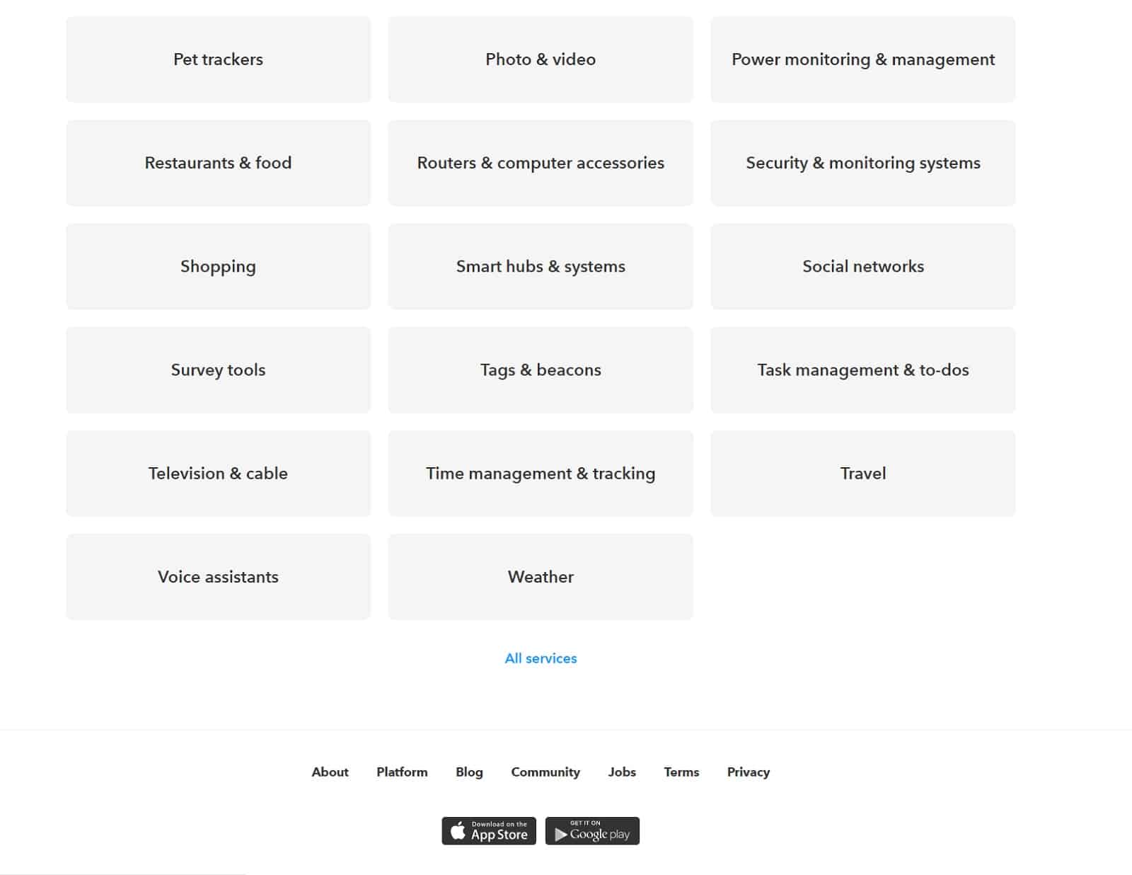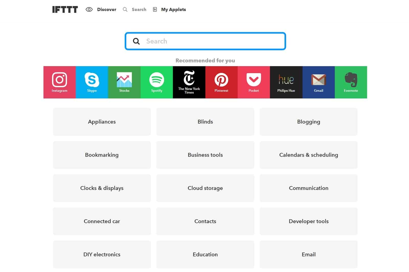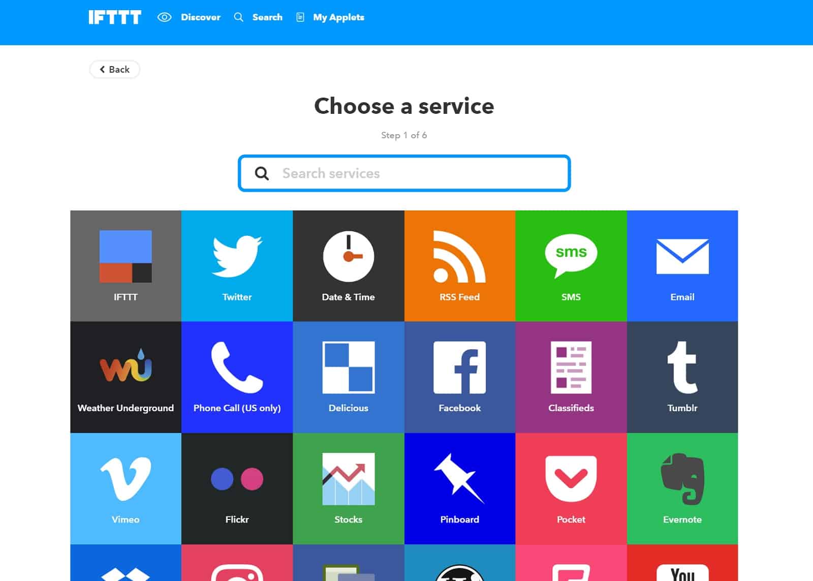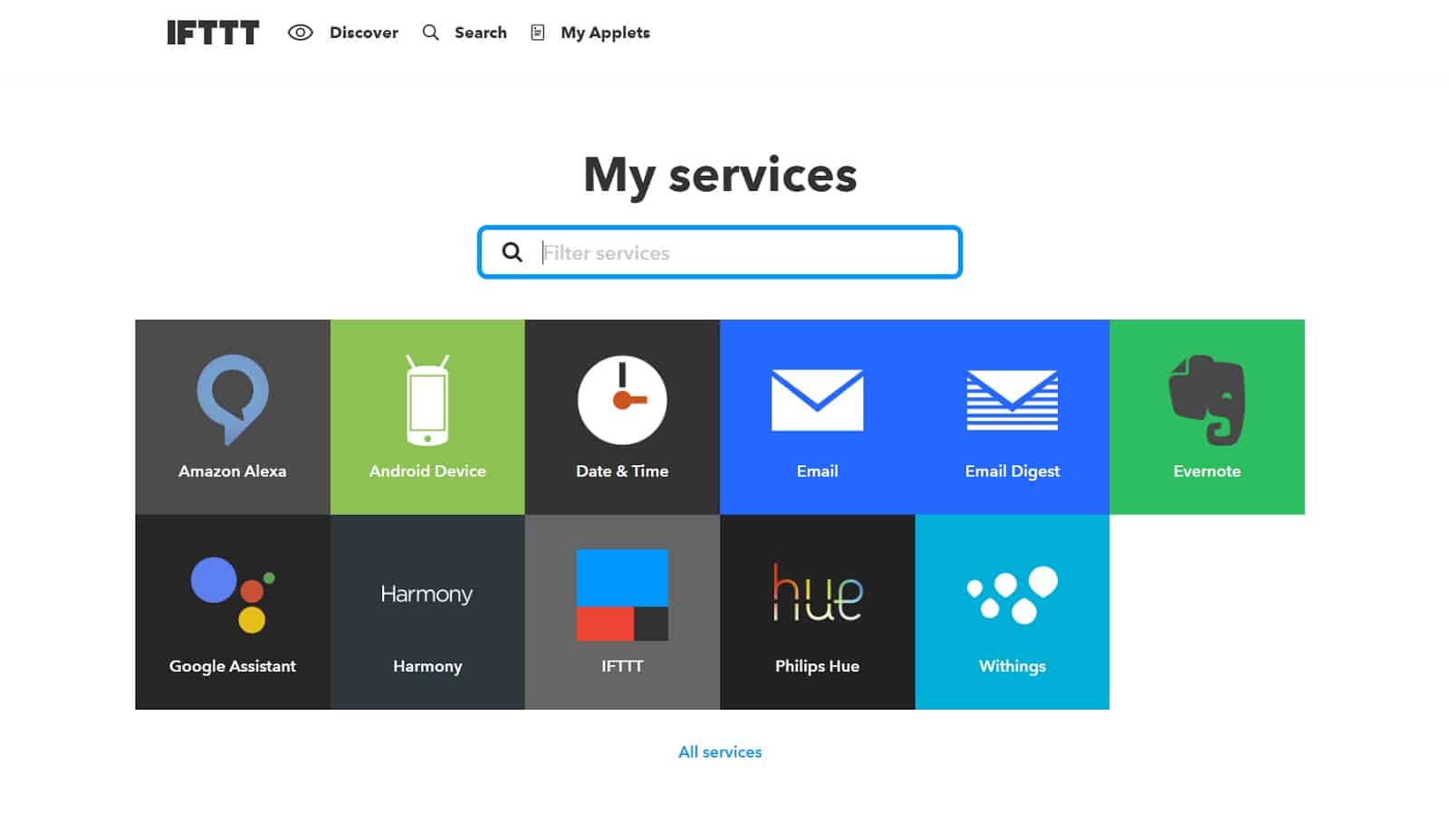 Kommen wir als erstes zu den Services. Die Services stellen die Anbieter der Produkte dar. Amazon Alexa ist also ein Service von IFTTT. Logitech Harmony, Gmail, Evernote und Philips Hue sind weitere Services, nur um mal ein paar davon zu nennen. Auf der Seite von IFTTT könnt ihr euch alle Services anschauen oder einfach direkt danach suchen, wenn ihr euch was bestimmtes einfällt.