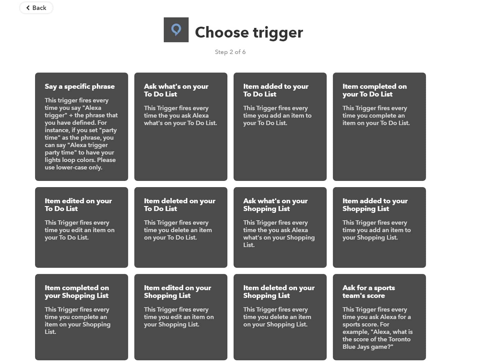 - Auf dieser Seite könnt ihr euch nun einen Trigger aussuchen. Das ist die Aktion, die passieren muss, damit Alexa das tut, was ihr mit diesem Applet erreichen wollt. Wir wählen nun „specific Phrase“ aus. Das bedeutet der Trigger ist ein von euch gewähltes Wort.