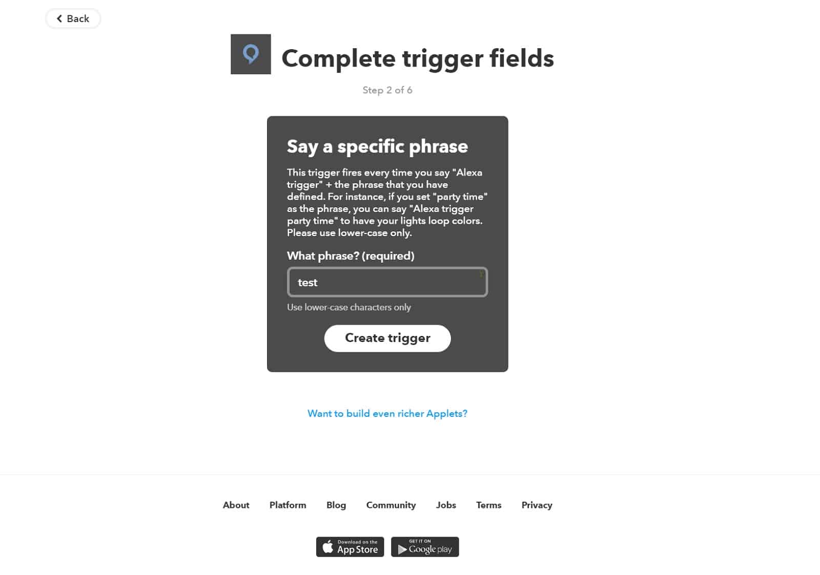 - Hier tragt ihr nun eure „specific Phrase“ ein. Das kann ein Wort oder ein Satz sein. Alles muss hier kleingeschrieben werden, damit es keine Fehler gibt. Versucht Wörter zu nehmen, die am besten auf Englisch ähnlich wie auf Deutsch klingen und für Alexa leicht verständlich sind.