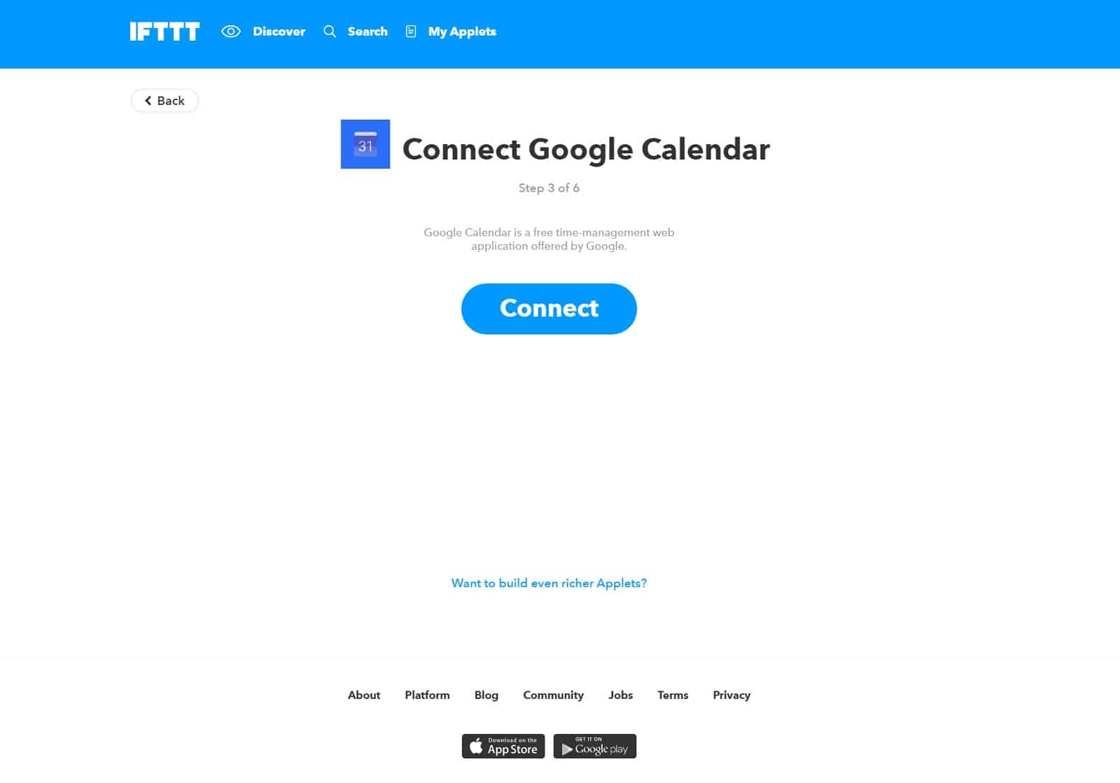 - Da ich noch nicht mit diesem Service verbunden war, wird das hier nun nachgeholt. Ich klicke auf Connect und es öffnet sich ein weiteres Fenster im Browser, indem ich zustimmen muss, dass IFTTT auf meinen Google Calendar zugreifen darf. Dies Bejahe ich.