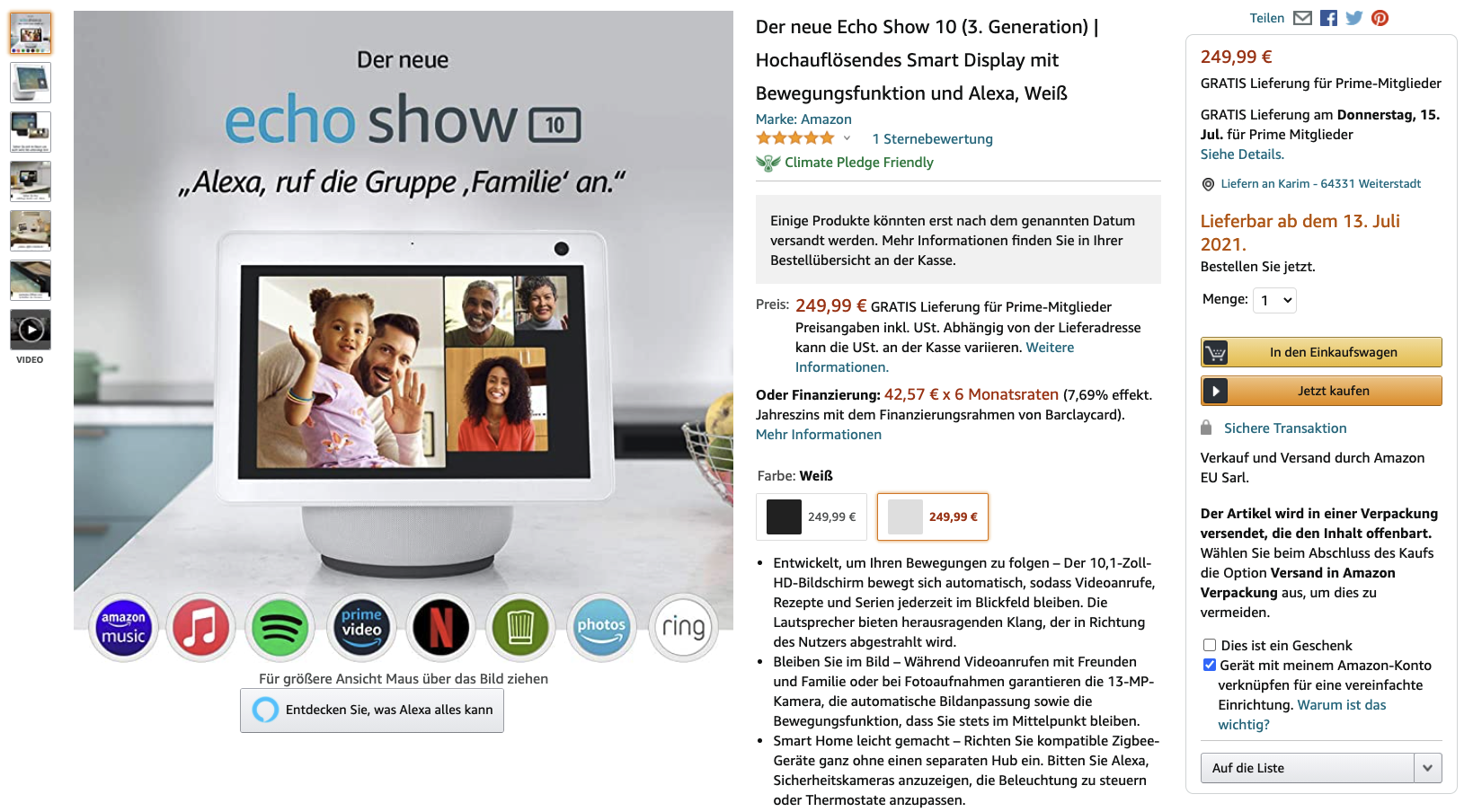 Schaut man sich das Lieferdatum des schwarzen Show 10 an, sagt einem Amazon, dass er erst ab dem 17. Juni geliefert wird. Schaut man sich das weiße Modell an, steht dort sogar erst der 13. Juli. Ihr müsst also mindestens 2, wenn nicht sogar 3 Monate auf den neuen Smartspeaker von Amazon warten.