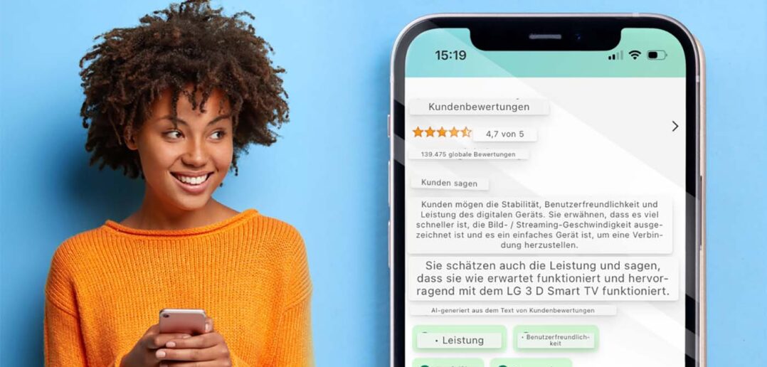 Das Bewertungssystem will Amazon in den USA mit KI-Unterstützung aufpimpen. So sollen die wichtigsten Punkte aus den abgegebenen Rezensionen in Auszügen direkt auf der Produktseite angezeigt werden. Dies soll Kunden noch schneller darüber informieren, was andere Käufer über ein Produkt gesagt haben.