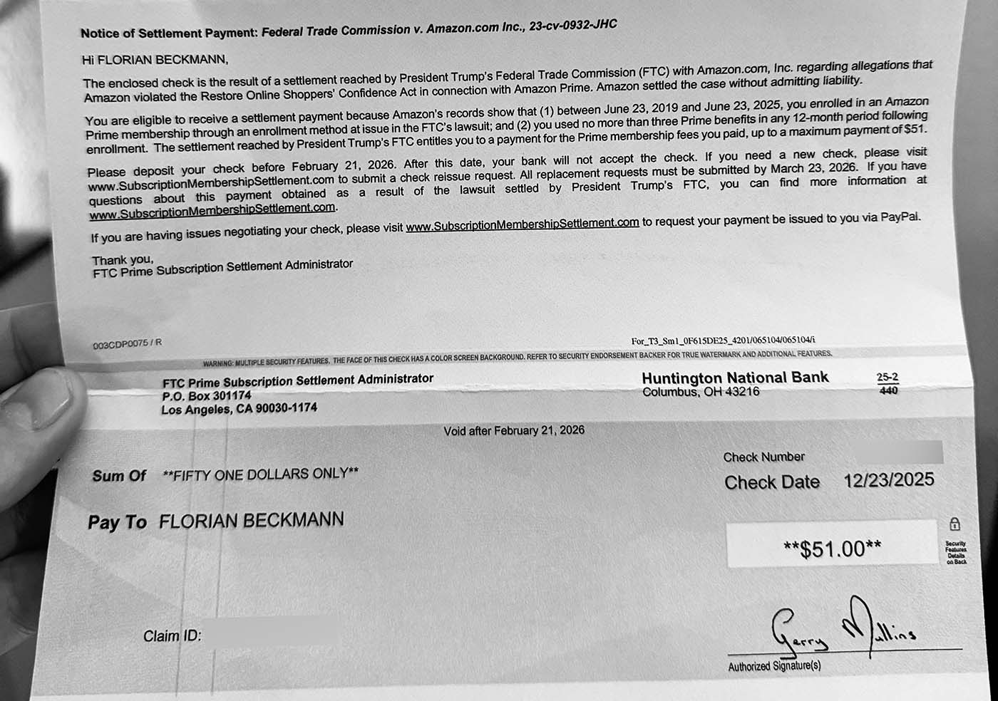 Der Brief enthält einen Scheck über 51 US-Dollar und bezieht sich auf einen Vergleich, den Amazon mit der FTC geschlossen hat. Hintergrund sind Vorwürfe, wonach Amazon Kunden in der Vergangenheit durch wenig transparente Anmeldeprozesse in kostenpflichtige Prime-Mitgliedschaften geführt und die Kündigung unnötig erschwert haben soll. Amazon hat den Vergleich akzeptiert, ohne ein Fehlverhalten offiziell einzuräumen.