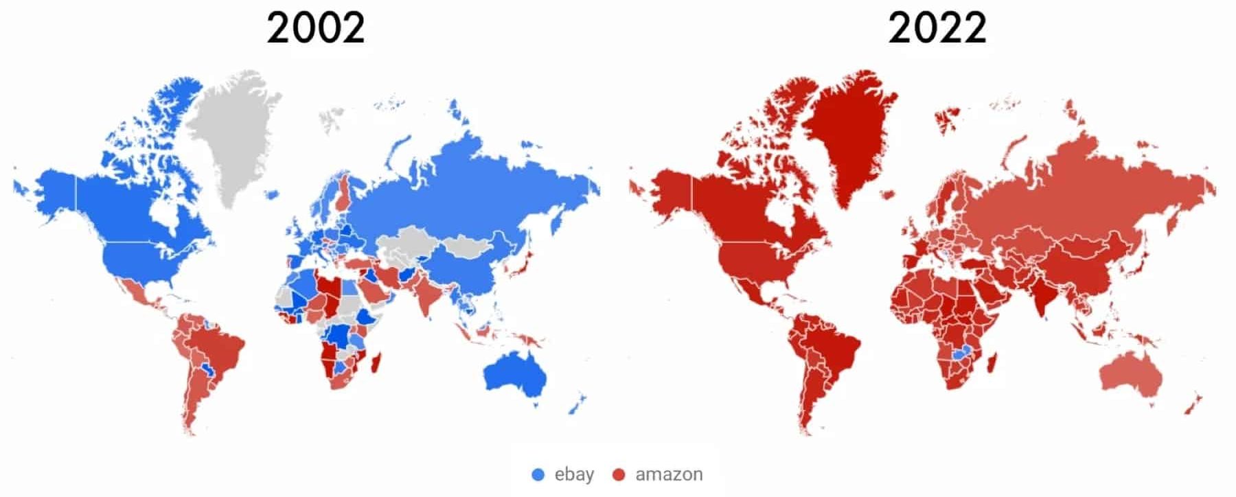 Im Jahr 2008 war es so weit und Amazon übertraf erstmals den Unternehmenswert von eBay. Jetzt, im Jahr 2022, ist Amazon sogar weltweit beliebter als eBay. Amazon hat eBay einfach die Welt geklaut!