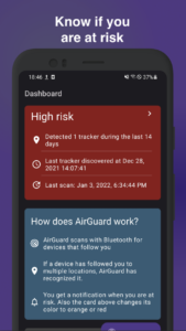 Wenn ihr die App installiert habt, wird die Umgebung eures Smartphones regelmäßig gescannt. Innerhalb von einer Stunde erhaltet ihr eine Benachrichtigung, sobald ein fremdes Tracking-Gerät erkannt wird. Dabei werden nicht nur Apple AirTags erkannt, sondern auch andere Bluetooth-Tracker. Die App zeigt euch den Risikostatus in grün („no risk“) oder rot („high risk“) an. Diese Anzeige erinnert sehr an die Corona-Warn-App. Wenn ein Tracker in eurer Nähe erkannt wird, könnt ihr anhand des Risikostatus die Anzahl der erkannten Tracker und den Zeitpunkt des Auffindens ablesen. Zudem seht ihr in der App auch den letzten Zeitpunkt des Umgebungsscanns.