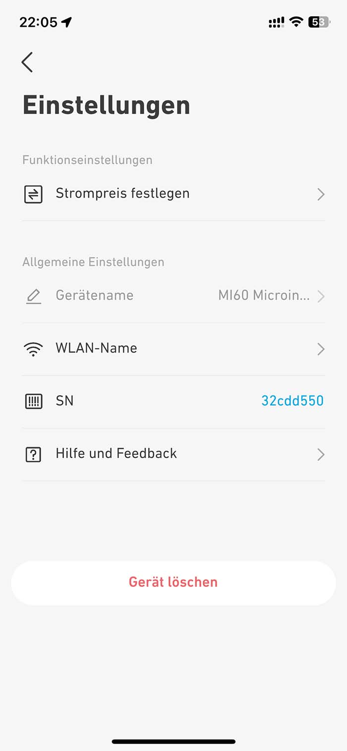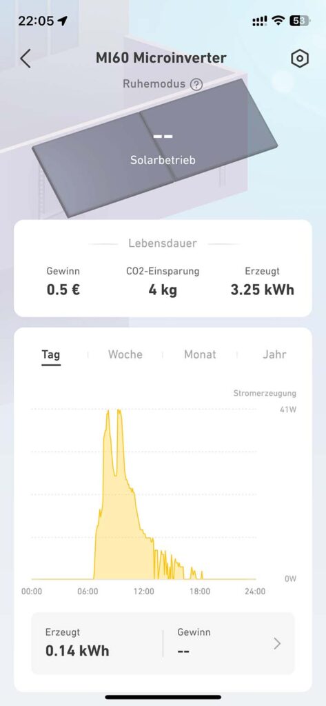 In der App verbindet man sich im ersten Schritt mit dem aufgebauten WLAN des Wechselrichters und gibt dabei das eigene WLAN sowie das Passwort dafür an. Hat man dies erledigt, steht die Verbindung zum Balkonkraftwerk. Die ersten Werte werden nach etwa 15 bis 20 Minuten angezeigt und man sieht ab dann live den Strom, welchen das Balkonkraftwerk produziert und einspeist. In der App kann man außerdem seinen Preis pro kWh eingeben, wodurch die durch das Balkonkraftwerk eingesparten Energiekosten genau angezeigt werden können. Zudem zeigt die App an, wie viel CO₂ man eingespart hat.